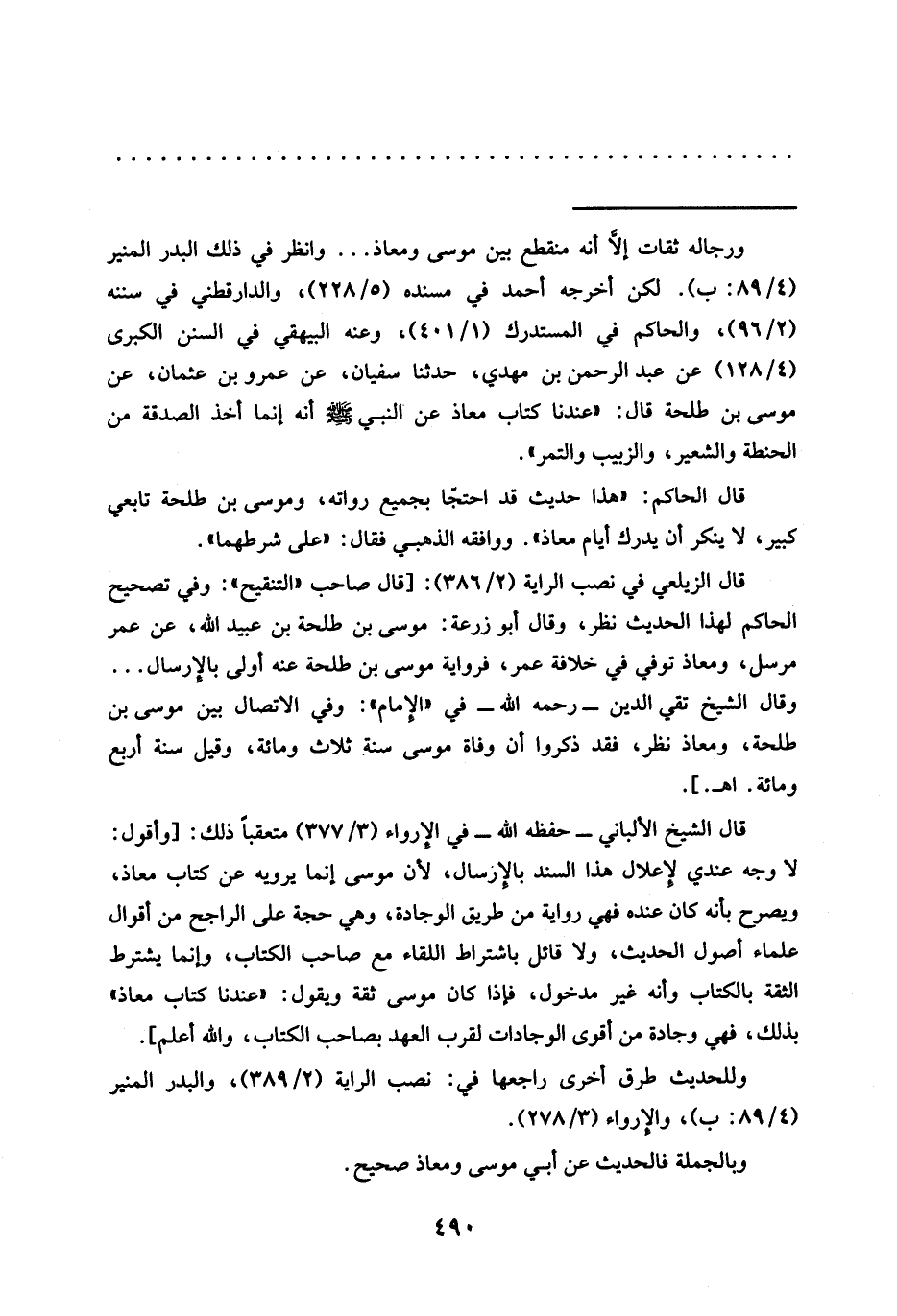 = ورجاله ثقات إلَّا أنه منقطع بين موسى ومعاذ ... وانظر في ذلك البدر المنير (4/ 89: ب). لكن أخرجه أحمد في مسنده (5/ 228)، والدارقطني في سننه (2/ 96)، والحاكم في المستدرك (1/ 401)، وعنه البيهقي في السنن الكبرى (4/ 128) عن عبد الرحمن بن مهدي، حدثنا سفيان، عَنْ عَمْرِو بْنِ عُثْمَانَ، عَنْ مُوسَى بْنِ طلحة قال: (عندنا كتاب معاذ عَنِ النَّبِيِّ -صَلَّى اللَّهُ عَلَيْهِ وَسَلَّمَ- أَنَّهُ إنما أخذ الصدقة من الحنطة والشعير، والزبيب والتمر".