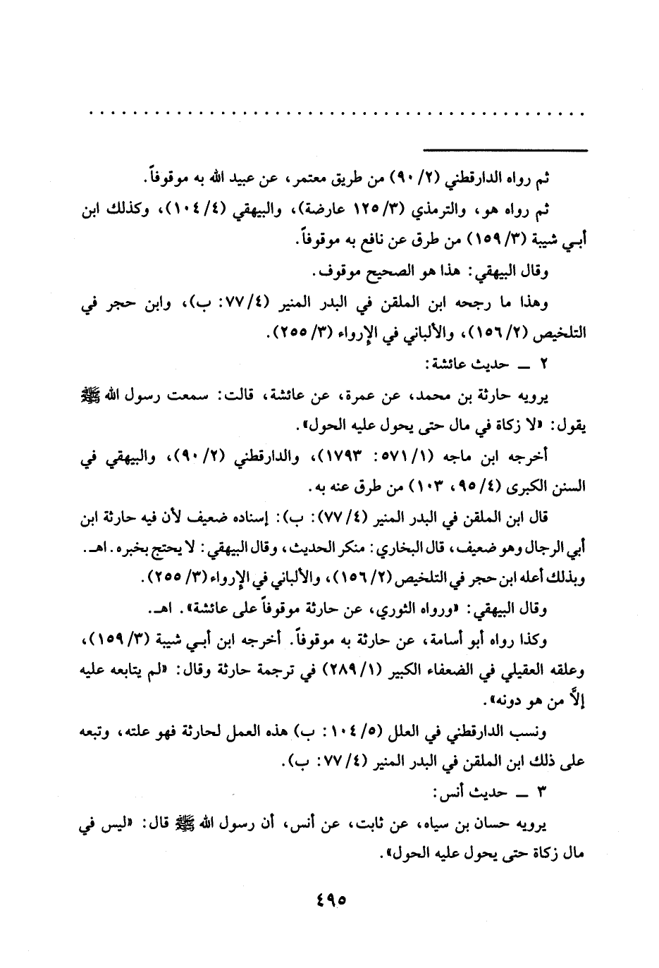 يرويه حَارِثَةَ بْنِ مُحَمَّدٍ، عَنْ عَمْرَةَ، عَنْ عَائِشَةَ، قَالَتْ: سَمِعْتُ رَسُولَ اللَّهِ -صَلَّى الله عليه وسلم- يقول: إلا زَكَاةَ فِي مَالٍ حَتَّى يَحُولَ عَلَيْهِ الْحَوْلُ".