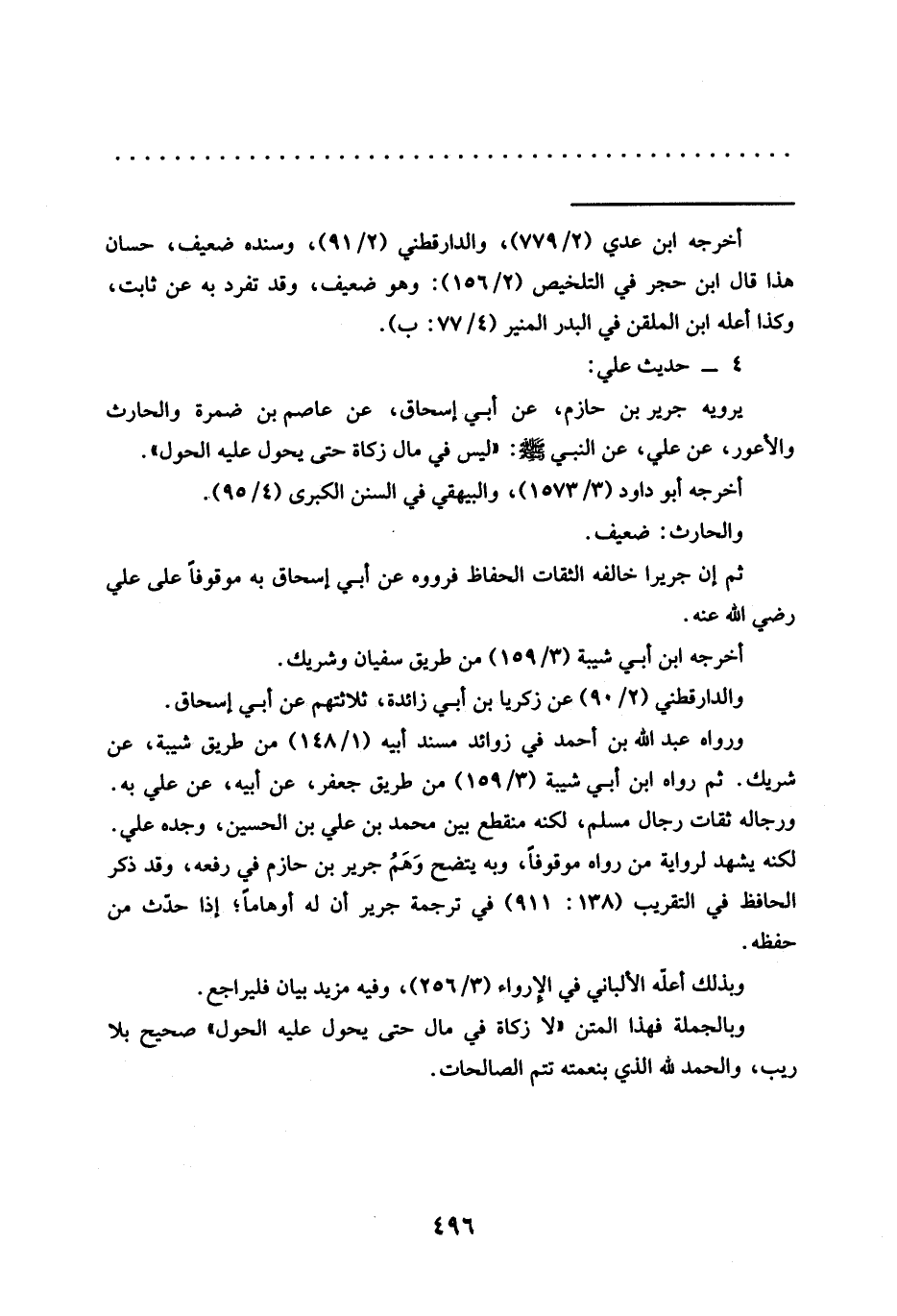 يرويه جرير بن حازم، عَنْ أَبِي إِسْحَاقَ، عَنْ عَاصِمِ بْنِ ضَمْرَةَ والحارث والأعور، عَنْ عَلِيٍّ، عَنِ النَّبِيِّ -صَلَّى اللَّهُ عَلَيْهِ وَسَلَّمَ-: "لَيْسَ في مال زكاة حتى يحول عليه الحول".