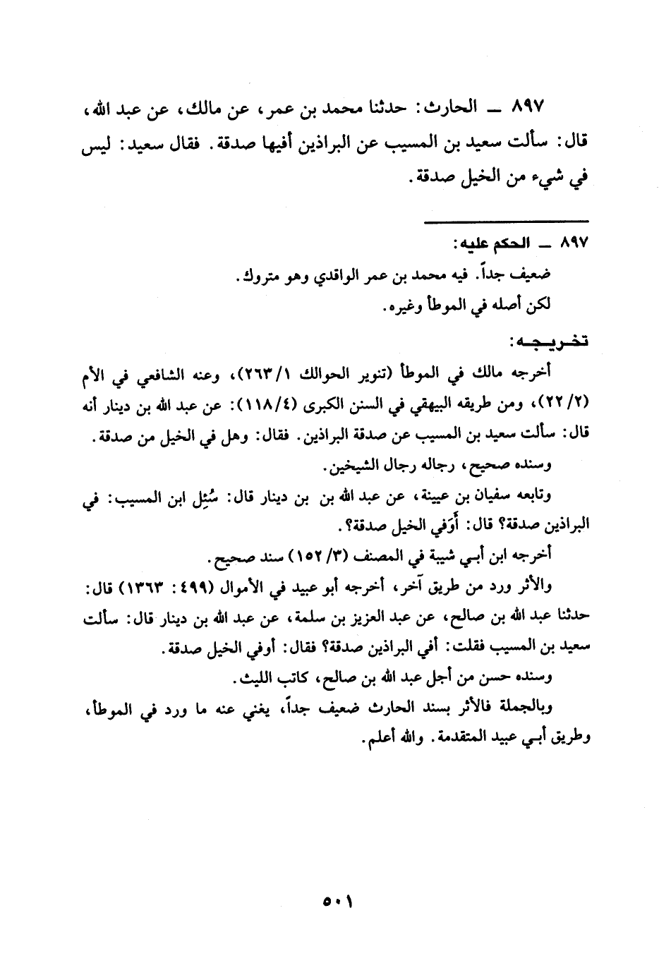 حَدَّثَنَا مُحَمَّدُ بْنُ عُمَرَ عَنْ مَالِكٍ عَنْ عَبْدِ اللَّهِ قَالَ سَأَلْتُ سَعِيدَ بْنَ الْمُسَيِّبِ عَنِ البراذين أفيها صدق فَقَالَ سَعِيدٌ §لَيْسَ فِي شَيْءٍ مِنَ الْخَيْلِ صَدَقَةٌ