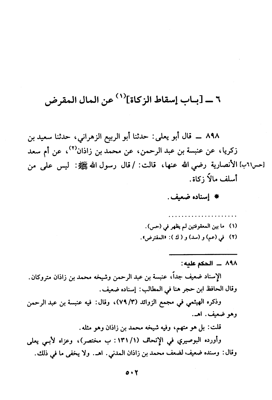 حَدَّثَنَا أَبُو الرَّبِيعِ الزَّهْرَانِيُّ حَدَّثَنَا سَعِيدُ بْنُ زَكَرِيَّا عَنْ عَنْبَسَةَ بْنِ عَبْدِ الرَّحْمَنِ عَنْ مُحَمَّدِ بْنِ زَاذَانَ عَنْ أُمِّ سَعْدٍ الْأَنْصَارِيَّةِ رَضِيَ الله عَنْهَا قَالَتْ قَالَ رَسُولُ اللَّهِ صَلَّى اللَّهُ عَلَيْهِ وَسَلَّمَ §لَيْسَ عَلَى مَنْ أَسْلَفَ مَالًا زَكَاةٌ