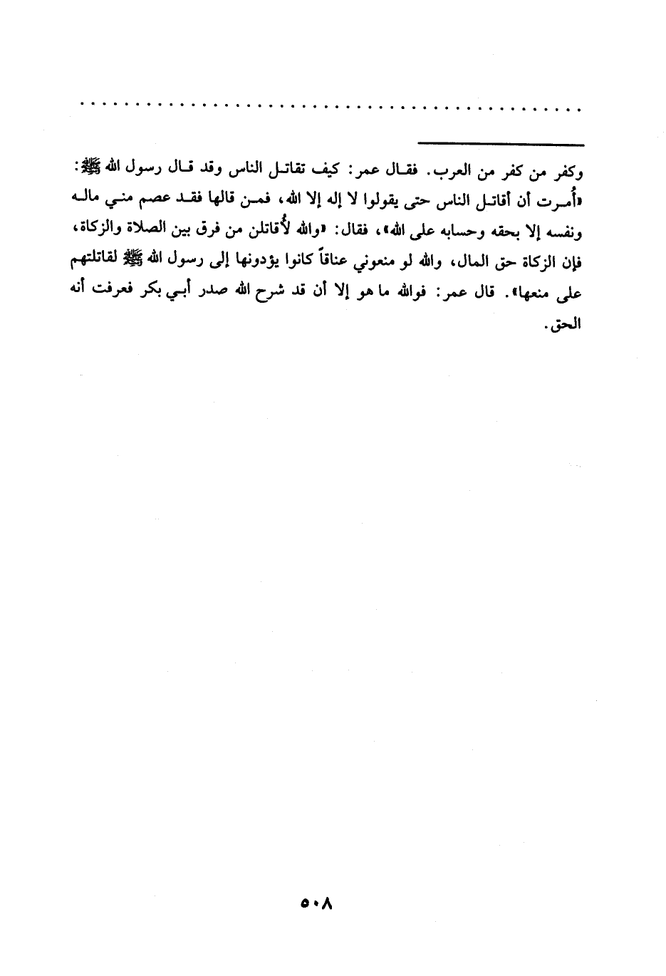 = وكفر من كفر من العرب. فقال عمر: كيف تقاتل الناس وَقَدْ قَالَ رَسُولُ اللَّهِ -صَلَّى اللَّهُ عَلَيْهِ وسلم-: "أُمرت أَنْ أُقَاتِلَ النَّاسَ حَتَّى يَقُولُوا لَا إِلَهَ إلا الله، فمن قالها فقد عصم مني ماله ونفسه إلا بحقه وحسابه على الله،، فقال: "والله لأقاتلن من فرق بين الصلاة والزكاة، فإِن الزكاة حق المال، والله لو منعوني عناقًا كانوا يؤدونها إلى رسول الله -صلى الله عليه وسلم- لقاتلتهم على منعها". قال عمر: فوالله ما هو إلا أن قد شرح الله صدر أبي بكر فعرفت أنه الحق.