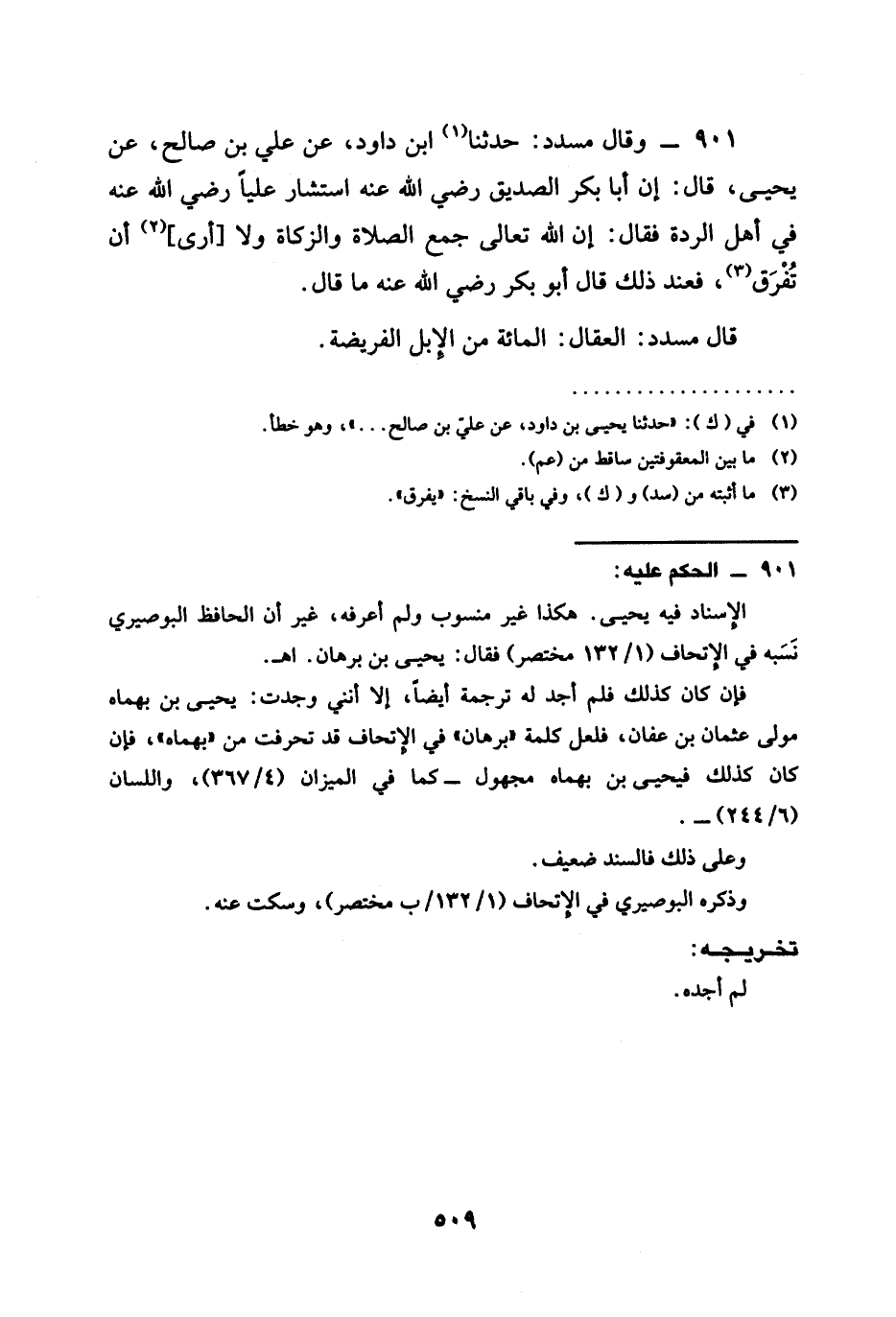 حَدَّثَنَا ابْنُ دَاوُدَ عَنْ عَلِيِّ بْنِ صَالِحٍ عَنْ يَحْيَى قَالَ إِنَّ أَبَا بَكْرٍ الصِّدِّيقَ رَضِيَ الله عَنْهُ اسْتَشَارَ عَلِيًّا رَضِيَ الله عَنْهُ فِي أَهْلِ الرِّدَّةِ فَقَالَ §إن الله تعالى جَمَعَ الصَّلَاةَ وَالزَّكَاةَ وَلَا أَرَى أَنْ تُفَرِّقَ فَعِنْدَ ذَلِكَ قَالَ أَبُو بَكْرٍ رَضِيَ الله عَنْهُ مَا قَالَ قَالَ مُسَدَّدٌ الْعِقَالُ الْمِائَةُ مِنَ الْإِبِلِ الْفَرِيضَةُ