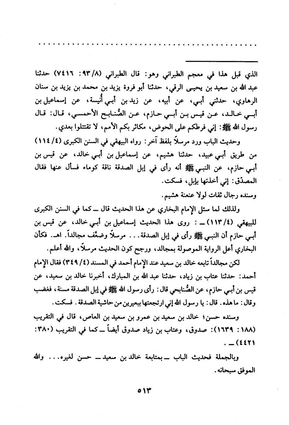 لكن مجالدًا تابعه خالد بن سعيد عند الإِمام أحمد في المسند (4/ 349) فقال الإِمام أحمد: حدثنا عتاب بن زياد، حدثنا عبد الله بن المبارك، أخبرنا خالد بن سعيد، عن قيس بن أبي حازم، عن الصُّنابحي قَالَ: رَأَى رَسُولُ اللَّهِ -صَلَّى اللَّهُ عَلَيْهِ وسلم- في إبل الصدقة مسنة، فغضب وقال: ما هذه. قال: يَا رَسُولَ اللَّهِ إِنِّي ارْتَجَعْتُهَا بِبَعِيرَيْنِ مِنْ حاشية الصدقة. فسكت.
