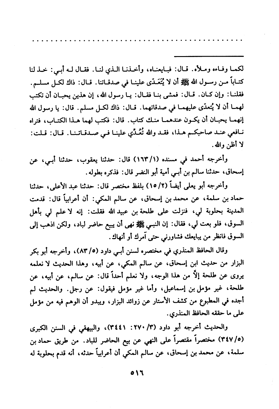 والحديث أخرجه أبو داود (3/ 270: 3441)، والبيهقي في السنن الكبرى (5/ 347) مختصرًا مقتصرًا على النهي عن بيع الحاضر للباد. من طريق حماد بْنُ سَلَمَةَ، عَنْ مُحَمَّدِ بْنِ إِسْحَاقَ، عَنْ سالم المكي أن أعرابيًا حدثه، أنه قدم بحلوبة له=
