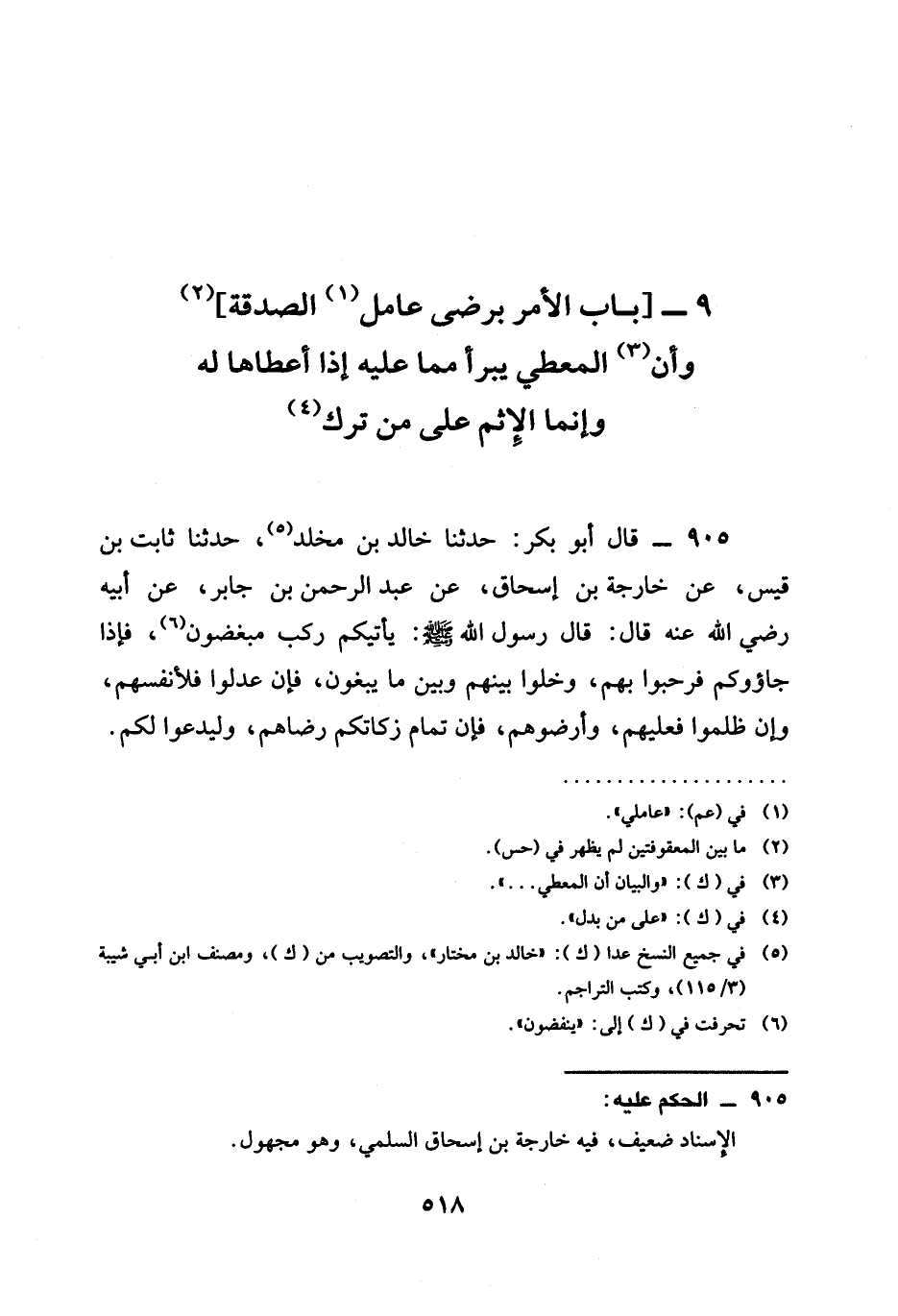 حَدَّثَنَا خَالِدُ بْنُ مَخْلَدٍ حَدَّثَنَا ثَابِتُ بْنُ قَيْسٍ عَنْ خَارِجَةَ بْنِ إِسْحَاقَ عَنْ عَبْدِ الرَّحْمَنِ بْنِ جَابِرٍ عَنْ أَبِيهِ رَضِيَ الله عَنْهُ قَالَ قَالَ رَسُولُ اللَّهِ صَلَّى اللَّهُ عَلَيْهِ وَسَلَّمَ §يَأْتِيكُمْ رَكْبٌ مُبْغِضُونَ فَإِذَا جاؤوكم فَرَحِّبُوا بِهِمْ وَخَلُّوا بَيْنَهُمْ وَبَيْنَ مَا يَبْغُونَ فَإِنْ عَدَلُوا فَلِأَنْفُسِهِمْ وَإِنْ ظَلَمُوا فَعَلَيْهِمْ وَأَرْضُوهُمْ فَإِنَّ تَمَامَ زَكَاتِكُمْ رِضَاهُمْ وَلْيَدْعُوا لَكُمْ