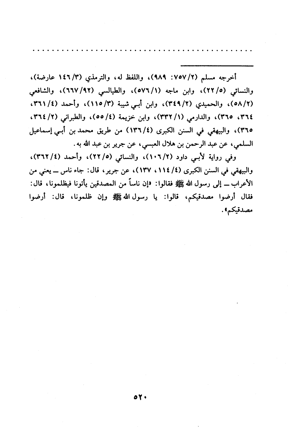 وفي رواية لأبي داود (2/ 106)، والنسائي (5/ 22)، وأحمد (4/ 362)، والبيهقي في السنن الكبرى (4/ 114، 137)، عن جرير، قال: جاء ناس -يعني من الأعراب- إلى رسول الله -صلى الله عليه وسلم- فقالوا: "إن ناسًا من المصدقين يأتونا فيظلمونا، قال: فقال أرضوا مصدقيكم، قَالُوا: يَا رَسُولَ اللَّهِ -صَلَّى اللَّهُ عَلَيْهِ وسلم- وإن ظلمونا، قال: أرضوا مصدقيكم".
