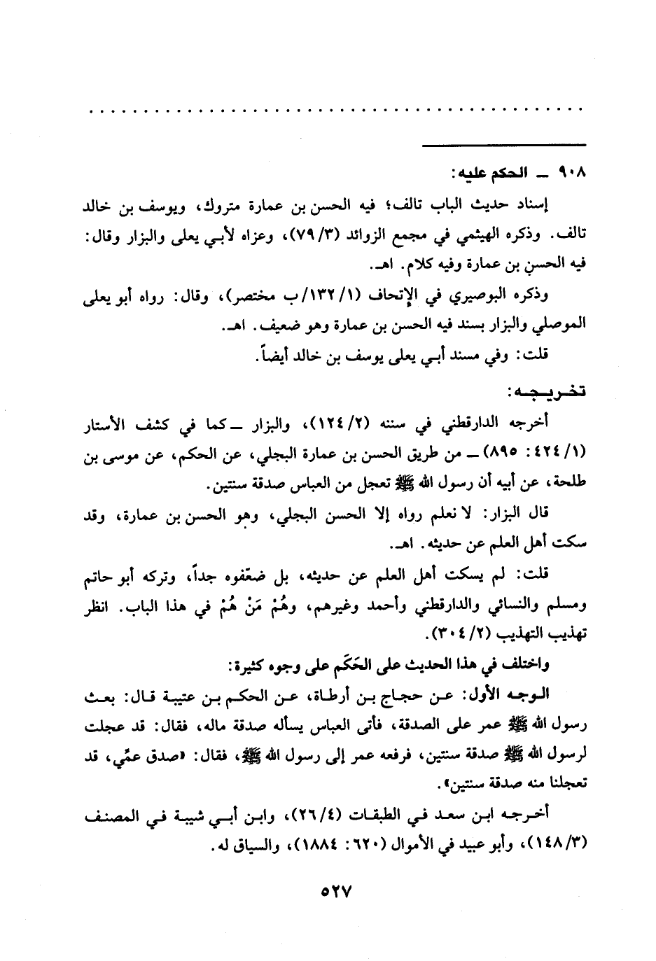 أخرجه الدارقطني في سننه (2/ 124)، والبزار -كما في كشف الأستار (1/ 424: 895) - من طريق الحسن بن عمارة البجلي، عن الحكم، عَنْ مُوسَى بْنِ طَلْحَةَ، عَنْ أَبِيهِ أَنَّ رَسُولَ اللَّهِ -صَلَّى اللَّهُ عليه وسلم- تعجل من العباس صدقة سنتين.