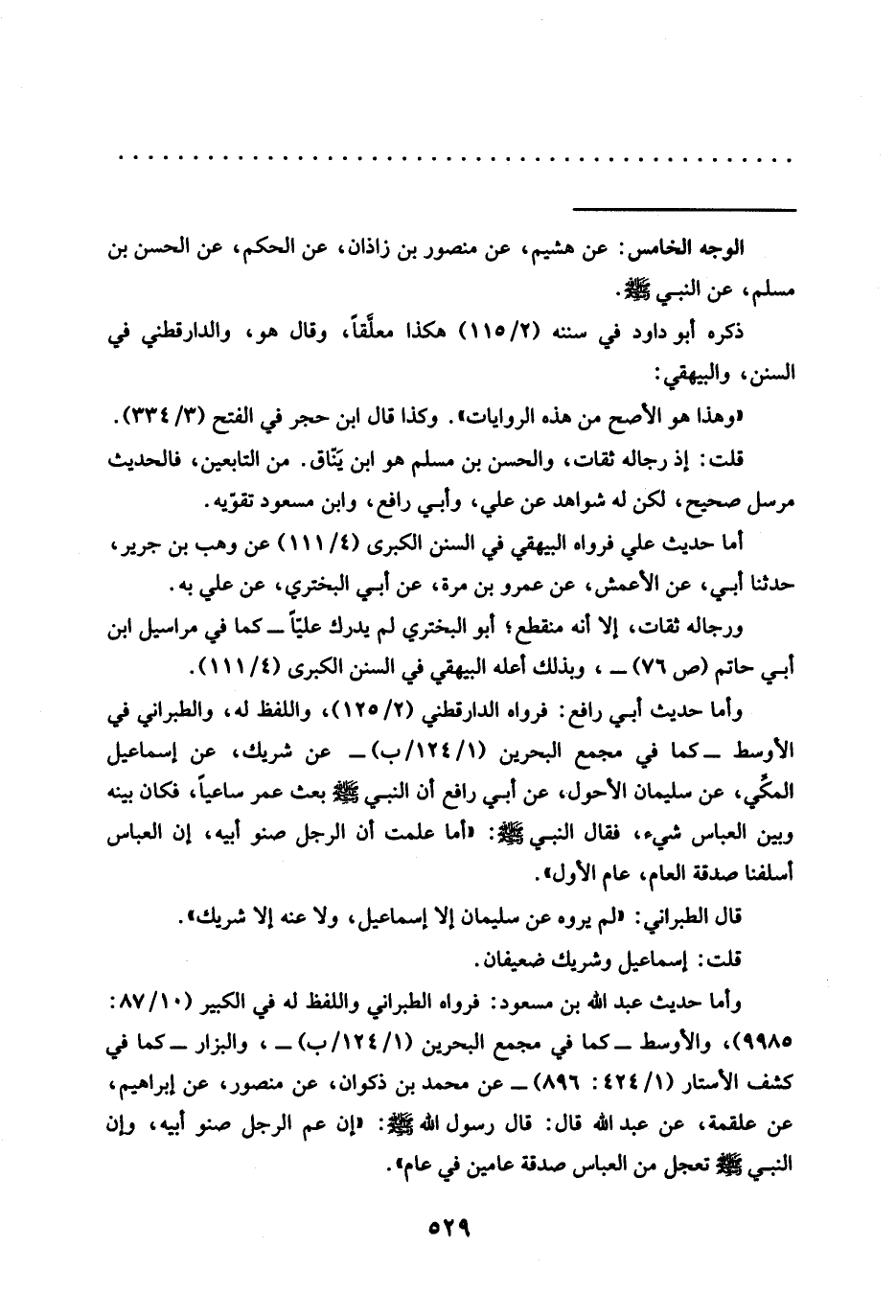 وأما حديث أبي رافع: فرواه الدارقطني (2/ 125)، واللفظ له، والطبراني في الأوسط -كما في مجمع البحرين (1/ 124/ ب) - عن شريك، عن إسماعيل المكي، عن سليمان الأحول، عن أبي رافع أَنَّ النَّبِيَّ-صَلَّى اللَّهُ عَلَيْهِ وَسَلَّمَ- بَعَثَ عمر ساعيًا، فكان بينه وبين العباس شيء، فَقَالَ النَّبِيُّ -صَلَّى اللَّهُ عَلَيْهِ وَسَلَّمَ-: "أَمَّا علمت أن الرجل صنو أبيه، إن العباس أسلفنا صدقة العام، عام الأول".