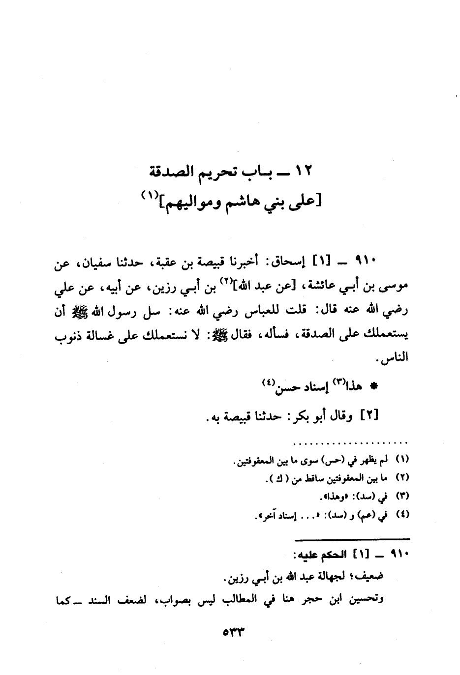 910 - إِسْحَاقُ: أَخْبَرَنَا قَبِيصَةُ بْنُ عُقْبَةَ حدثنا سُفْيَانُ عَنْ مُوسَى بْنِ أَبِي عَائِشَةَ عَنْ عَبْدِ اللَّهِ بْنِ أَبِي رَزِينٍ عَنْ أَبِيهِ عن علي رَضِيَ الله عَنْه قَالَ قلت للعباس رَضِيَ الله عَنْه سَلْ رَسُولَ اللَّهِ صَلَّى اللَّهُ عَلَيْهِ وَسَلَّمَ أَنْ يَسْتَعْمِلَكَ عَلَى الصَّدَقَةِ فَسَأَلَهُ فَقَالَ صَلَّى اللَّهُ عَلَيْهِ وَسَلَّمَ §لَا نَسْتَعْمِلُكَ عَلَى غُسَالَةِ ذُنُوبِ النَّاسِ