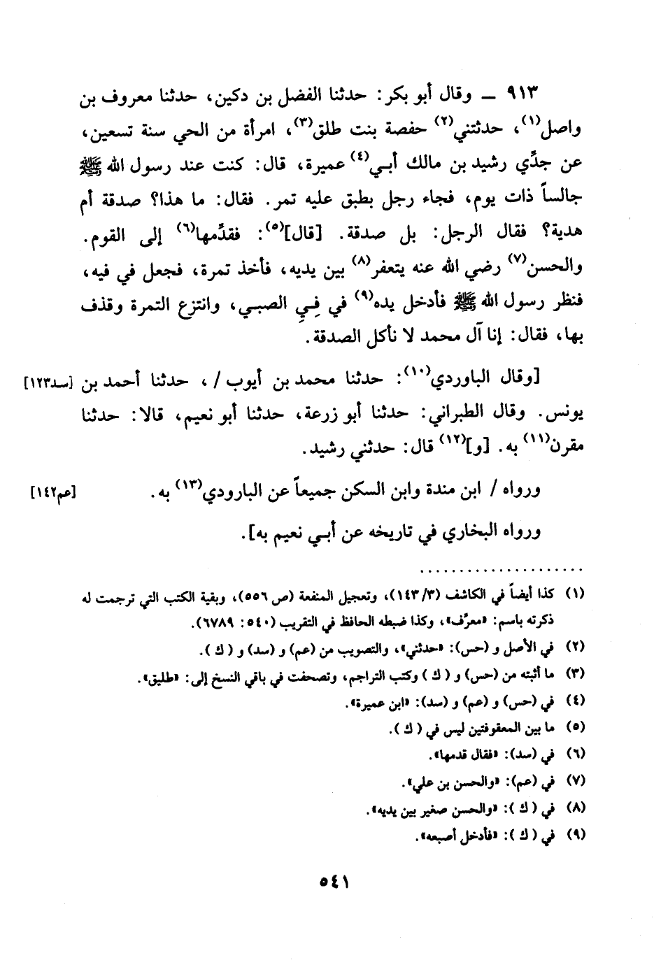 حَدَّثَنَا الْفَضْلُ بْنُ دُكَيْنٍ حدثنا مَعْرُوفُ بْنُ وَاصِلٍ حَدَّثَتْنِي حَفْصَةُ بِنْتُ طَلْقٍ امْرَأَةٌ مِنَ الْحَيِّ سَنَةَ تِسْعِينَ عَنْ جَدِّي رُشَيْدِ بْنِ مَالِكٍ أَبِي عَمِيرَةَ قَالَ كُنْتُ عِنْدَ رَسُولِ اللَّهِ صَلَّى اللَّهُ عَلَيْهِ وَسَلَّمَ جَالِسًا ذَاتَ يَوْمٍ فَجَاءَ رَجُلٌ بِطَبَقٍ عَلَيْهِ تَمْرٌ فَقَالَ مَا هَذَا صَدَقَةٌ أَمْ هَدِيَّةٌ فَقَالَ الرَّجُلُ بل صدقة قال فَقَدَّمَهَا إِلَى القوم والحسن رَضِيَ الله عَنْه يتعفر بَيْنَ يَدَيْهِ فأخذ تمرة فجعل فِي فِيهِ فَنَظَرَ رَسُولُ الله صَلَّى اللَّهُ عَلَيْهِ وَسَلَّمَ فأدخل يده فِي فِيِّ الصَّبِيِّ وَانْتَزَعَ التَّمْرَةَ وَقَذَفَ بها فقال §إنا آلَ مُحَمَّدٍ لَا نَأْكُلُ الصَّدَقَةَ وقَالَ الْبَارُودِيُّ حدثنا مُحَمَّدُ بْنُ أَيُّوبَ حدثنا أَحْمَدُ بْنُ يُونُسَ. وَقَالَ الطَّبَرَانِيُّ: ثنا أَبُو زُرْعَةَ، ثنا أَبُو نُعَيْمٍ قَالَا: ثنا مُقَرِّنٌ بِهِ وقال حدثني رُشَيْدٌ وَرَوَاهُ ابْنُ مَنْدَهْ وَابْنُ السَّكَنِ جَمِيعًا عَنِ الْبَارُودِيِّ بِهِ وَرَوَاهُ الْبُخَارِيُّ فِي تَارِيخِهِ عَنْ أَبِي نُعَيْمٍ بِهِ