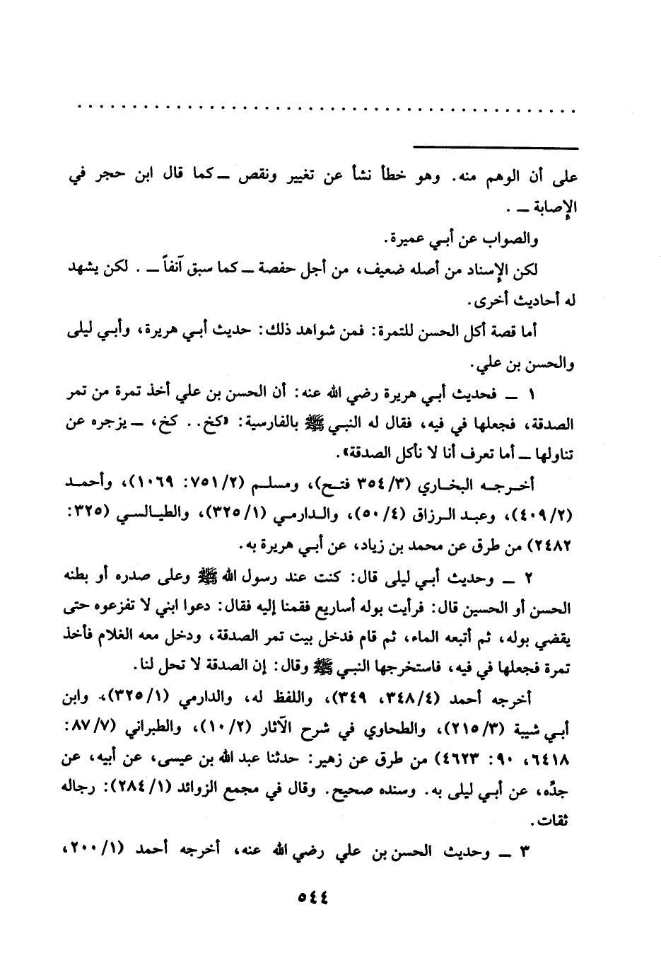 2 - وحديث أبي ليلى قَالَ: كُنْتُ عِنْدَ رَسُولِ اللَّهِ -صَلَّى اللَّهُ عَلَيْهِ وسلم- وعلى صدره أو بطنه الحسن أو الحسين قال: فرأيت بوله أساريع فقمنا إليه فقال: دعوا ابني لا تفزعوه حتى يقضي بوله، ثم أتبعه الماء، ثم قام فدخل بيت تمر الصدقة، ودخل معه الغلام فأخذ تمرة فجعلها في فيه، فاستخرجها النبي وقال: إن الصدقة لا تحل لنا.