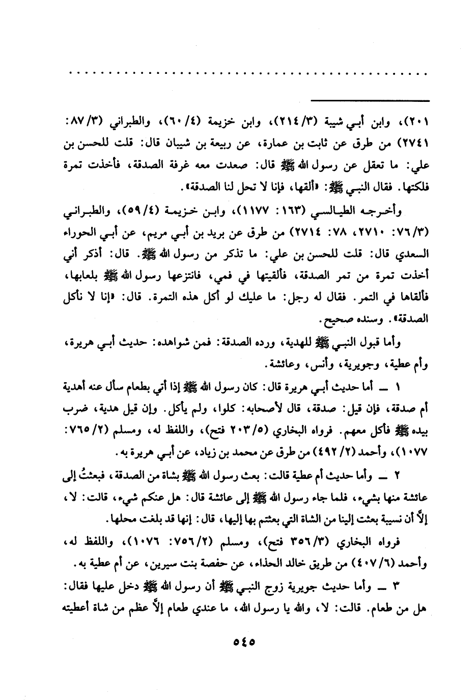 1 - أما حديث أَبِي هُرَيْرَةَ قَالَ: كَانَ رَسُولُ اللَّهِ -صَلَّى الله عليه وسلم- إذا أتي بطعام سأل عنه أهدية أم صدقة، فإِن قيل: صدقة، قال لأصحابه: كلوا، ولم يأكل. وإن قيل هدية، ضرب بيده -صلى الله عليه وسلم- فأكل معهم. فرواه البخاري (5/ 203 فتح)، واللفظ له، ومسلم (2/ 765: 1077)، وأحمد (2/ 492) من طرق عن محمد بن زياد، عن أبي هريرة به.