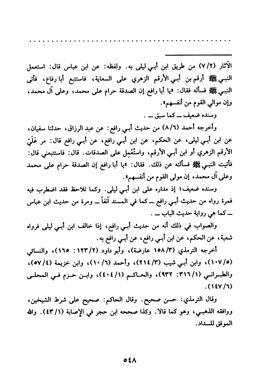 وأخرجه أحمد (6/ 8) من حديث أبي رافع: عن عبد الرزاق، حدثنا سُفْيَانُ، عَنِ ابْنِ أَبِي لَيْلَى، عَنِ الْحَكَمِ، عن ابن أبي رافع، عن أبي رافع قال: مر عَلَيّ الأرقم الزهري أو ابن أبي الأرقم، واستُعْمِل على الصدقات. قال: فاستتبعني قال:
