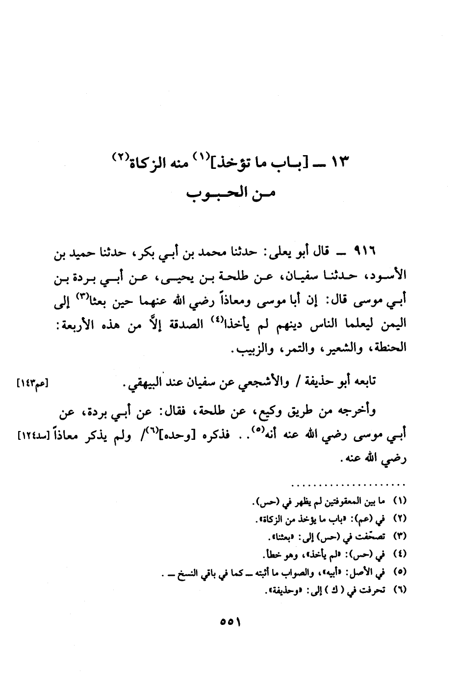حدثنا مُحَمَّدُ بْنُ أَبِي بَكْرٍ حدثنا حُمَيْدُ بْنُ الْأَسْوَدِ حدثنا سُفْيَانُ عَنْ طَلْحَةَ بْنِ يَحْيَى عَنْ أَبِي بُرْدَةَ بْنِ أبي موسى قال أَنَّ أَبَا موسى ومعاذاً رَضِيَ الله عَنْهما حِينَ بُعِثَا إِلَى الْيَمَنِ لِيُعَلِّمَا النَّاسَ دِينَهُمْ §لَمْ يَأْخُذَا الصَّدَقَةَ إِلَّا مِنْ هَذِهِ الْأَرْبَعَةِ الْحِنْطَةِ وَالشَّعِيرِ وَالتَّمْرِ وَالزَّبِيبِ تَابَعَهُ أَبُو حُذَيْفَةَ وَالْأَشْجَعِيُّ عَنْ سُفْيَانَ عِنْدَ الْبَيْهَقِيِّ وَأَخْرَجَهُ مِنْ طَرِيقِ وَكِيعٍ عَنْ طَلْحَةَ فَقَالَ عَنْ أَبِي بُرْدَةَ عَنْ أبي موسى رَضِيَ الله عَنْه أَنَّهُ فَذَكَرَهُ وَحْدَهُ وَلَمْ يذكر معاذا رَضِيَ الله عَنْه