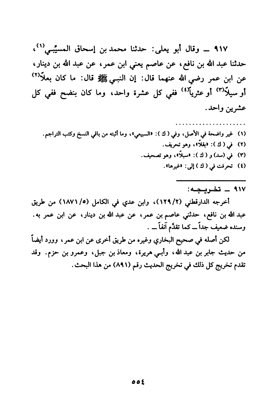 حَدَّثنا مُحَمَّدُ بْنُ إِسْحَاقَ الْمُسَيَّبِيُّ حدثنا عَبْدُ اللَّهِ بْنُ نَافِعٍ عَنْ عَاصِمٍ يَعْنِي ابْنَ عُمَرَ عَنْ عَبْدِ اللَّهِ بْنِ دِينَارٍ عَنِ ابن عمر رَضِيَ الله عَنْهما قال أَنَّ النَّبِيَّ صَلَّى اللَّهُ عَلَيْهِ وَسَلَّمَ قَالَ §مَا كَانَ بَعْلًا أَوْ سَيْلًا أَوْ عَثَرِيًّا فَفِي كُلِّ عَشَرَةٍ وَاحِدٌ وما كان بنضح فَفِي كُلِّ عِشْرِينَ وَاحِدٌ