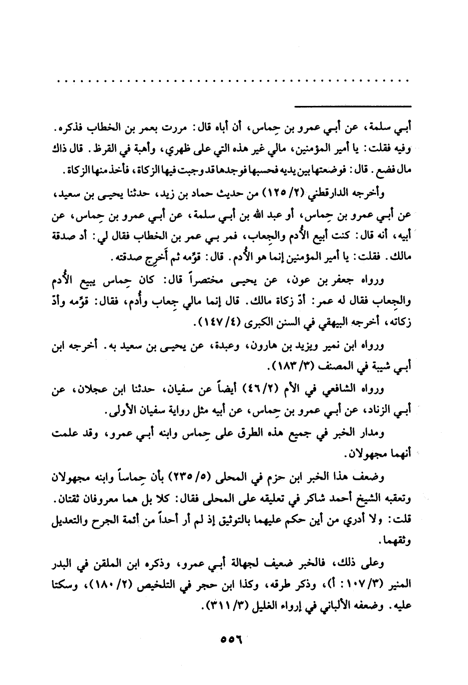 وأخرجه الدارقطني (2/ 125) من حديث حماد بن زيد، حدثنا يحيى بن سعيد، عن أبي عمرو بن حِماس، أو عَبْدُ اللَّهِ بْنُ أَبِي سَلَمَةَ، عَنْ أَبِي عمرو بن حِماس، عن أبيه، أنه قال: كنت أبيع الأُدم والجِعاب، فمر بي عمر بن الخطاب فقال لي: أد صدقة مالك. فقلت: يا أمير المؤمنين إنما هو الأُدم. قال: قوِّمه ثم أَخرِج صدقته.
