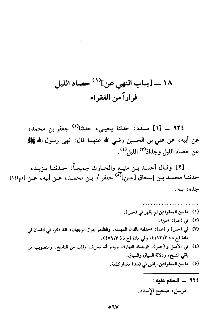 حَدَّثَنَا يَحْيَى حدثنا جَعْفَرُ بْنُ مُحَمَّدٍ عَنْ أَبِيهِ عَنْ عَلِيِّ بن الحسين رَضِيَ الله عَنْهما قَالَ §نَهَى رَسُولُ اللَّهِ صَلَّى اللَّهُ عَلَيْهِ وَسَلَّمَ عَنْ حصاد الليل وجذاذ اللَّيْلِ وَقَالَ أَحْمَدُ بْنُ مَنِيعٍ وَالْحَارِثُ جَمِيعًا حَدَّثَنَا يَزِيدُ حدثنا مُحَمَّدُ بْنُ إِسْحَاقَ عَنْ جَعْفَرِ بْنِ مُحَمَّدٍ عَنْ أَبِيهِ عَنْ جَدِّهِ بِهِ