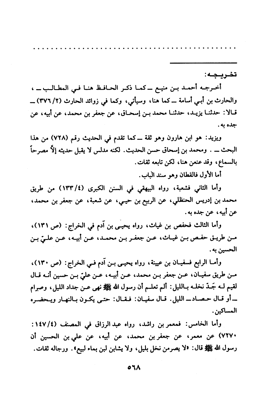 وأما الرابع فسفيان بن عيينة، رواه يحيى بن آدم في الخراج: (ص 130)، من طريق سُفْيَانُ، عَنْ جَعْفَرُ بْنُ مُحَمَّدٍ، عَنْ أَبِيهِ، عن عليّ بن حسين أنه قال لقيم له جَدّ نخله بالليل: أَلَمْ تَعْلَمْ أَنَّ رَسُولَ اللَّهِ -صَلَّى اللَّهُ عليه وسلم- نهى عن جداد الليل، وصرام -أو قال حصاد- الليل. قال سفيان: فقال: حتى يكون بالنهار ويحضره المساكين.