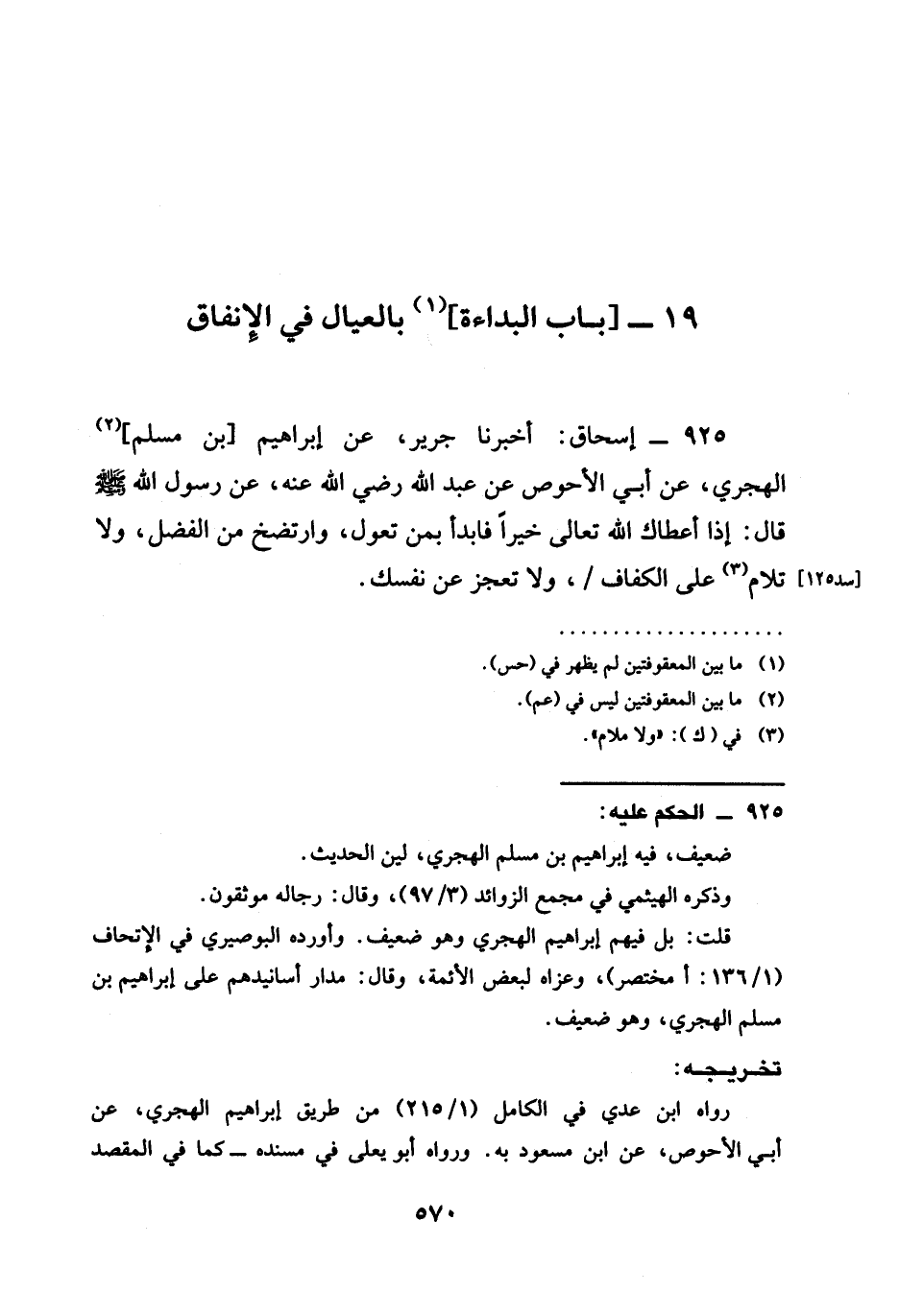أَخْبَرَنَا جَرِيرٌ عَنْ إِبْرَاهِيمَ بْنِ مُسْلِمٍ الْهَجَرِيِّ عَنْ أَبِي الْأَحْوَصِ عَنْ عبد الله رَضِيَ الله عَنْه عَنْ رَسُولِ اللَّهِ صَلَّى اللَّهُ عَلَيْهِ وَسَلَّمَ قَالَ §إِذَا أعطاك الله تعالى خَيْرًا فَابْدَأْ بِمَنْ تَعُولُ وَارْتَضِخْ مِنَ الْفَضْلِ وَلَا تُلَامُ عَلَى الْكَفَافِ وَلَا تَعْجِزْ عَنْ نَفْسِكَ