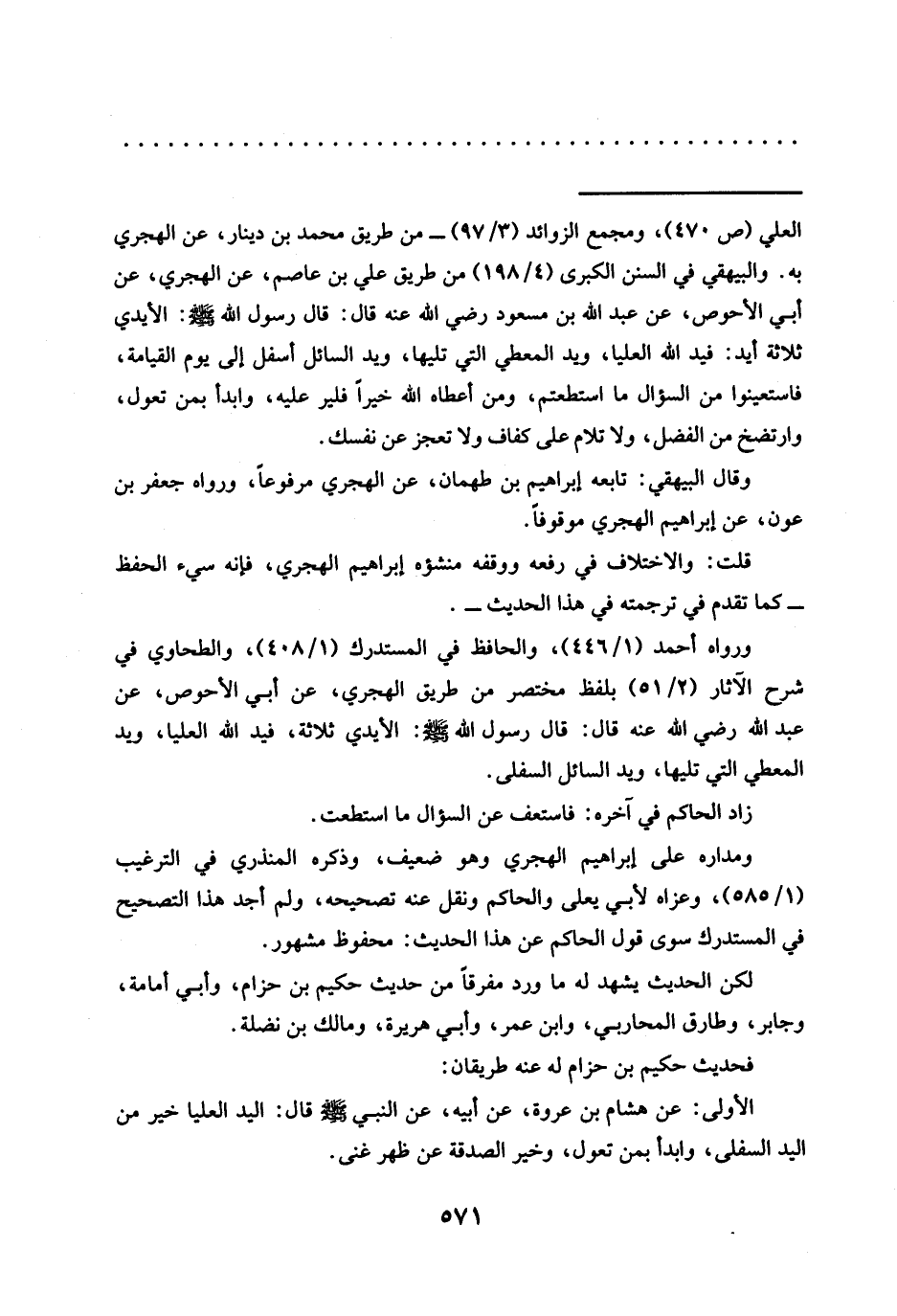 = العلي (ص 470)، ومجمع الزوائد (3/ 97) - من طريق محمد بن دينار، عن الهجري به. والبيهقي في السنن الكبرى (4/ 198) من طريق علي بن عاصم، عَنِ الْهَجَرِيِّ، عَنْ أَبِي الْأَحْوَصِ، عَنْ عَبْدِ اللَّهِ بْنِ مَسْعُودٍ رَضِيَ اللَّهُ عَنْهُ قَالَ: قَالَ رَسُولُ اللَّهِ -صَلَّى اللَّهُ عَلَيْهِ وَسَلَّمَ-: الأيدي ثلاثة أيد: فيد الله العليا، ويد المعطي التي تليها، ويد السائل أسفل إلى يوم القيامة، فاستعينوا من السؤال ما استطعتم، ومن أعطاه الله خيرًا فلير عليه، وابدأ بِمَنْ تَعُولُ، وَارْتَضِخْ مِنَ الْفَضْلِ، وَلَا تُلَامُ على كفاف ولا تعجز عن نفسك.