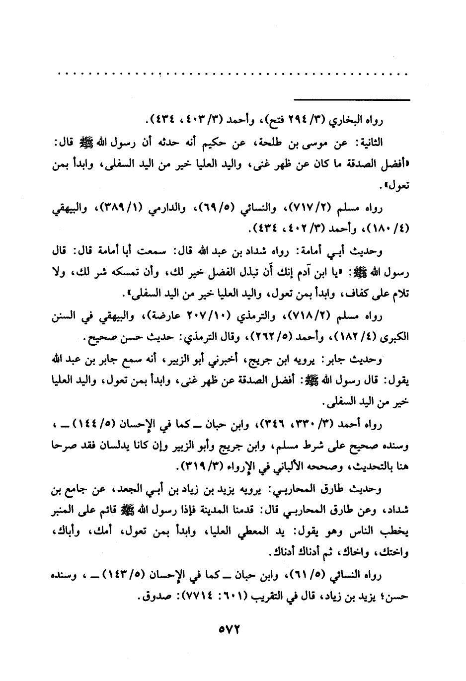 الثانية: عن موسى بن طلحة، عن حكيم أنه حَدَّثَهُ أَنَّ رَسُولَ اللَّهِ -صَلَّى اللَّهُ عَلَيْهِ وسلم- قال: "أفضل الصدقة ما كان عن ظهر غنى، واليد العليا خير من اليد السفلى، وابدأ بمن تعول".
