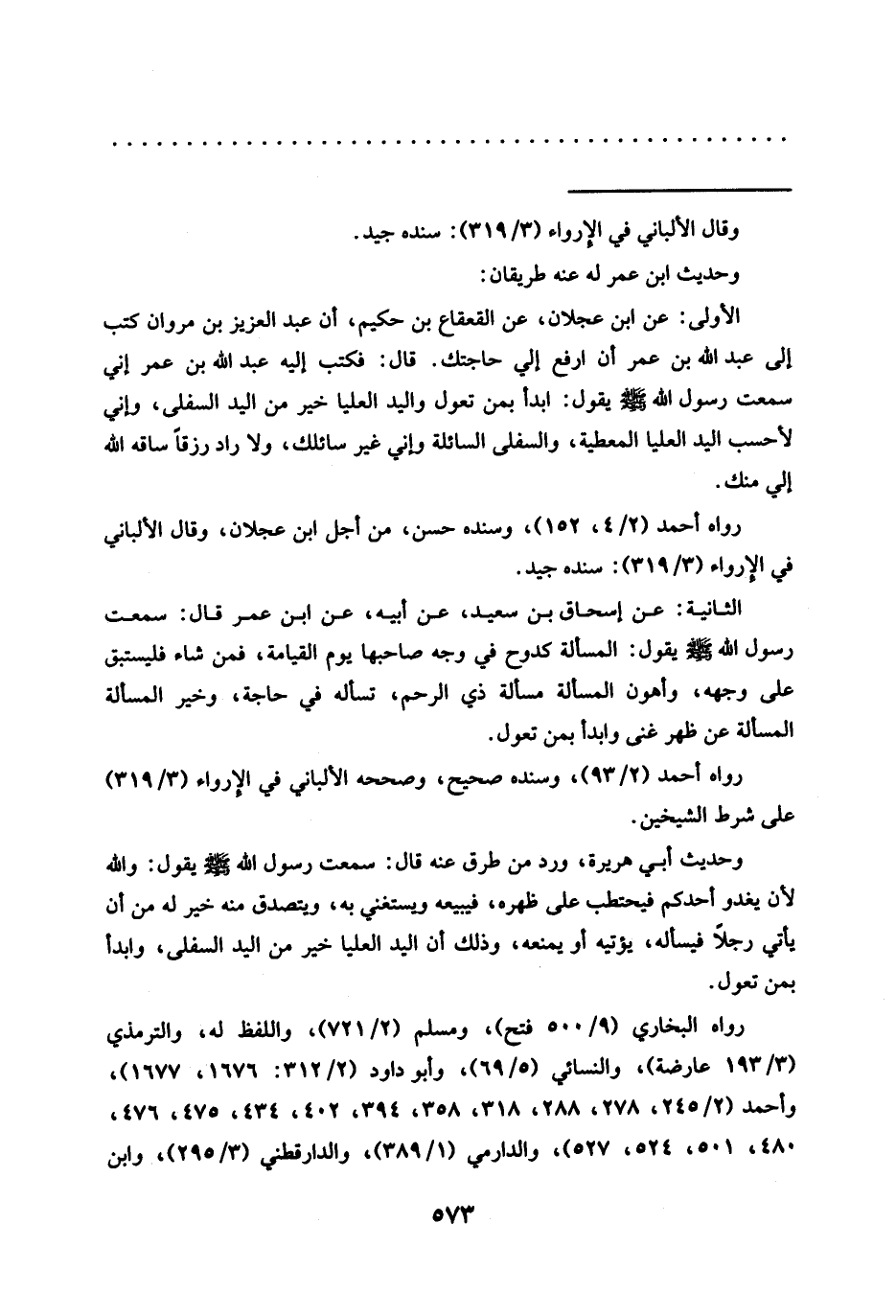 الأولى: عَنِ ابْنِ عَجْلَانَ، عَنِ الْقَعْقَاعِ بْنِ حَكِيمٍ، أن عبد العزيز بن مروان كتب إلى عبد الله بن عمر أن ارفع الي حاجتك. قال: فكتب إليه عبد الله بن عمر إني سمعت رسول الله -صلى الله عليه وسلم- يقول: ابدأ بمن تعول واليد العليا خير من اليد السفلى، وإني لأحسب اليد العليا المعطية، والسفلى السائلة وإني غير سائلك، ولا راد رزقًا ساقه الله إلي منك.