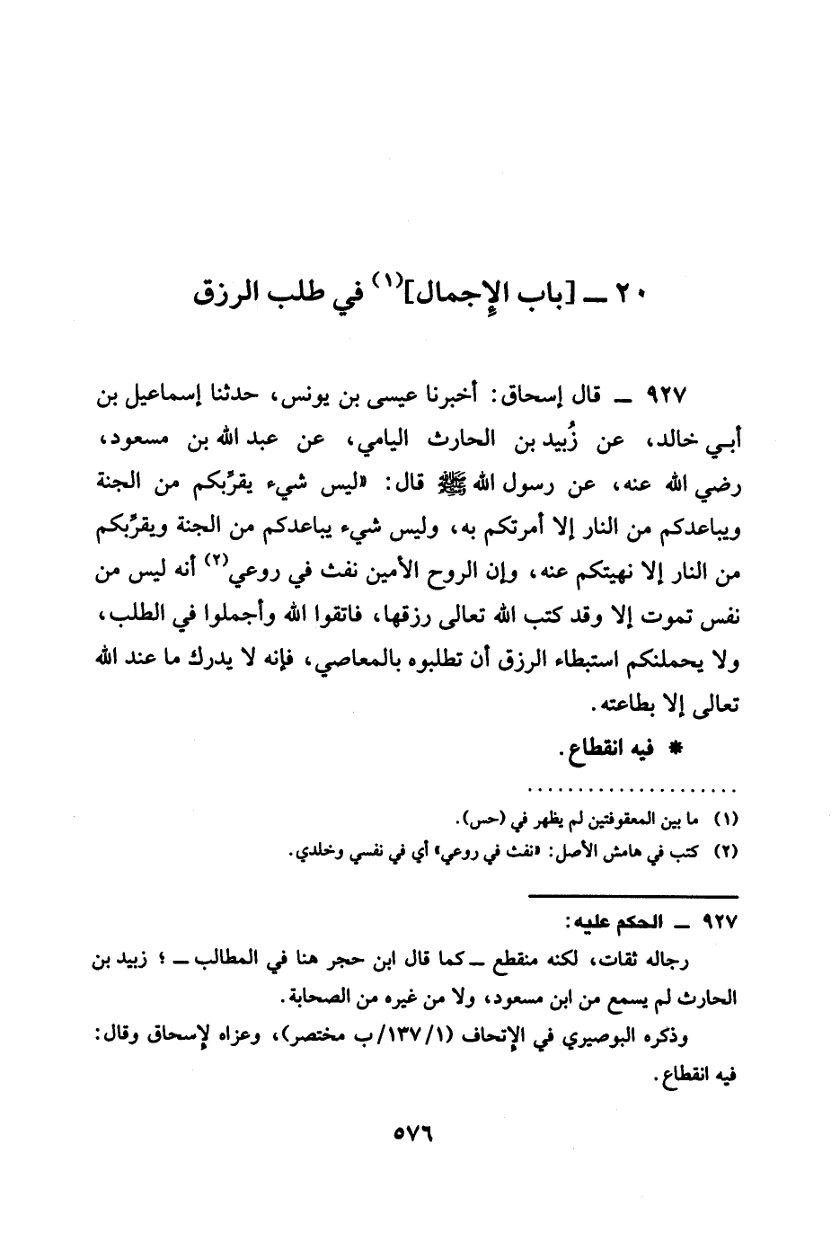 أَخْبَرَنَا عِيسَى بْنُ يُونُسَ حدثنا إِسْمَاعِيلُ بْنُ أَبِي خَالِدٍ عَنْ زُبَيْدِ بْنِ الْحَارِثِ الْيَامِيِّ عَنْ عَبْدِ اللَّهِ بن مسعود رَضِيَ الله عَنْه عَنْ رَسُولِ اللَّهِ صَلَّى اللَّهُ عَلَيْهِ وَسَلَّمَ قَالَ لَيْسَ شَيْءٌ يُقَرِّبُكُمْ مِنَ الْجَنَّةِ وَيُبَاعِدُكُمْ مِنَ النَّارِ إِلَّا أَمَرْتُكُمْ بِهِ وَلَيْسَ شَيْءٌ يُبَاعِدُكُمْ مِنَ الْجَنَّةِ وَيُقَرِّبُكُمْ مِنَ النَّارِ إِلَّا نَهَيْتُكُمْ عنه وإن §الروح الْأَمِينِ نَفَثَ فِي رُوعِيَ أَنَّهُ لَيْسَ مِنْ نَفْسٍ تَمُوتُ إِلَّا وَقَدْ كتب الله تعالى رِزْقُهَا فَاتَّقُوا اللَّهَ وَأَجْمِلُوا فِي الطَّلَبِ وَلَا يَحْمِلَنَّكُمُ اسْتِبْطَاءُ الرِّزْقِ أَنْ تَطْلُبُوهُ بِالْمَعَاصِي فَإِنَّهُ لَا يُدْرَكُ مَا عند الله تعالى إِلَّا بِطَاعَتِهِ فِيهِ انْقِطَاعٌ