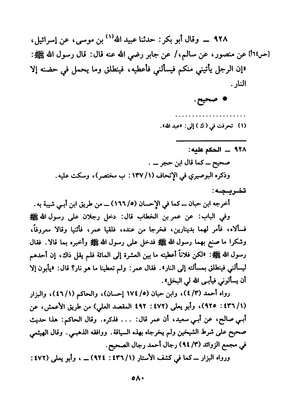 حَدَّثَنَا عُبَيْدُ اللَّهِ بْنُ مُوسَى عَنْ إِسْرَائِيلَ عَنْ مَنْصُورٍ عَنْ سَالِمٍ عن جابر رَضِيَ الله عَنْه قَالَ قَالَ رَسُولُ اللَّهِ صَلَّى اللَّهُ عَلَيْهِ وَسَلَّمَ إِنَّ §الرَّجُلَ يَأْتِينِي منكم فيسألني فأعطيه فَيَنْطَلِقُ وَمَا يَحْمِلُ فِي حُضْنِهِ إِلَّا النَّارَ
