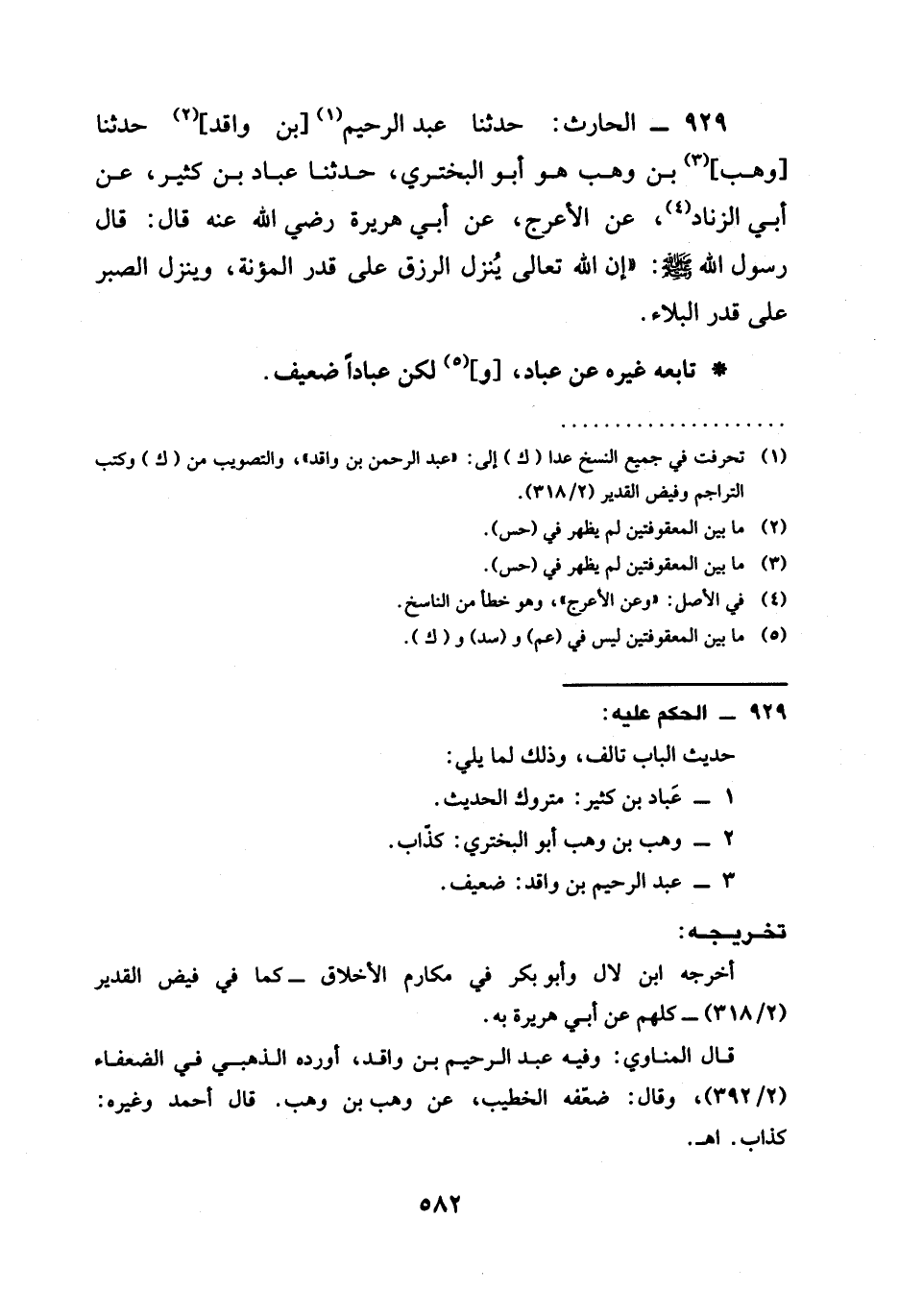 حَدَّثَنَا عَبْدُ الرَّحِيمِ بْنُ وَاقِدٍ حدثنا وَهْبُ بْنُ وَهْبٍ هُوَ أَبُو الْبَخْتَرِيِّ حدثنا عَبَّادُ بْنُ كَثِيرٍ عَنْ أَبِي الزِّنَادِ عَنِ الْأَعْرَجِ عَنْ أبي هريرة رَضِيَ الله عَنْه قَالَ قَالَ رَسُولُ اللَّهِ صَلَّى اللَّهُ عَلَيْهِ وَسَلَّمَ إن §الله تعالى يُنَزِّلُ الرِّزْقَ عَلَى قَدْرِ الْمُؤْنَةِ وَيُنَزِّلُ الصَّبْرَ عَلَى قَدْرِ الْبَلَاءِ