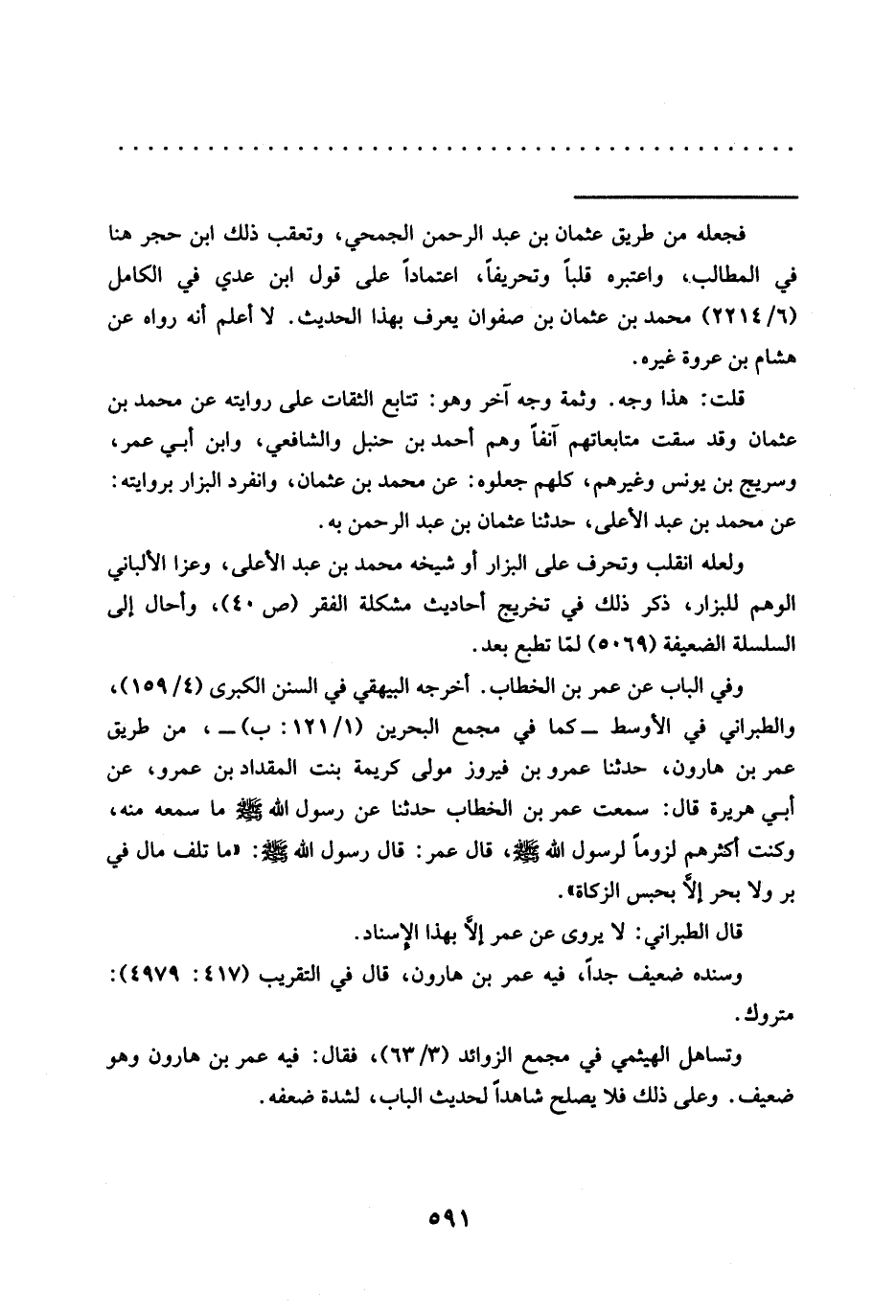 = فجعله من طريق عثمان بن عبد الرحمن الجمحي، وتعقب ذلك ابن حجر هنا في المطالب، واعتبره قلبًا وتحريفًا، اعتمادًا على قول ابن عدي في الكامل (6/ 2214) محمد بن عثمان بن صفوان يعرف بهذا الحديث. لا أعلم أنه رواه عن هشام بن عروة غيره.