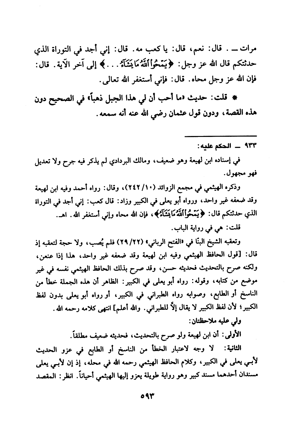 وذكره الهيثمي في مجمع الزوائد (10/ 242)، وقال: رواه أحمد وفيه ابن لهيعة وقد ضعفه غير واحد، ورواه أبو يعلى في الكبير وزاد: قال كعب: إِنِّي أَجِدُ فِي التَّوْرَاةِ الَّذِي حَدَّثْتُكُمْ قَالَ: {يَمْحُو اللَّهُ مَا يَشَاءُ}، فإِن الله محاه وإني أستغفر الله. اهـ.
