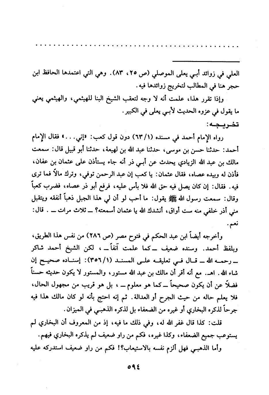 وأخرجه أيضًا ابن عبد الحكم في فتوح مصر (ص 286) من نفس هذا الطريق، وبلفظ أحمد. وسنده ضعيف -كما علمت آنفًا-، لكن الشيخ أحمد شاكر -رحمه الله- قال في تعليقه على المسند (1/ 356): إِسناده صحيح إن شاء الله. اهـ. مع أنه أقر أن مالك بن عبد الله مستور، والمستور لا يكون حديثه حسنًا فضلًا عن أن يكون صحيحًا -كما هو معلوم-، بل هو قريب من مجهول الحال، فلا يعلم حاله من حيث الجرح أو العدالة. ثم إنه احتج بأنه لو كان مالك هذا فيه جرحًا لذكره البخاري أو غيره من الضعفاء بل لذكره الذهبي في الميزان.