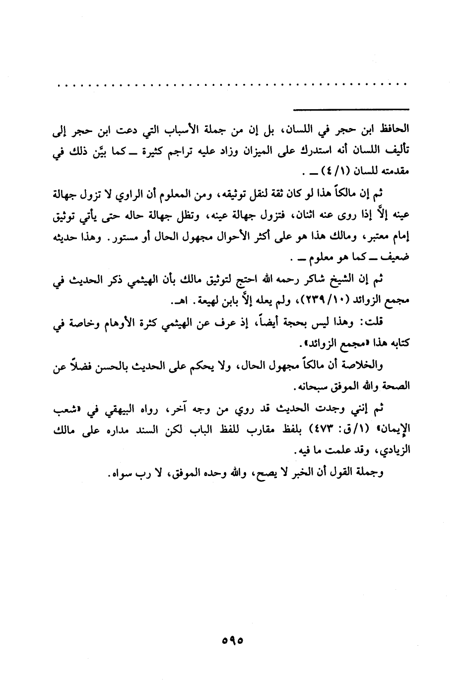 ثم إن مالكًا هذا لو كان ثقة لنقل توثيقه، ومن المعلوم أن الراوي لا تزول جهالة عينه إلَّا إذا روى عنه اثنان، فتزول جهالة عينه، وتظل جهالة حاله حتى يأتي توثيق إمام معتبر، ومالك هذا هو على أكثر الأحوال مجهول الحال أو مستور. وهذا حديثه ضعيف -كما هو معلوم-. ثم إن الشيخ شاكر رحمه الله احتج لتوثيق مالك بأن الهيثمي ذكر الحديث في مجمع الزوائد (10/ 239)، ولم يعله إلَّا بابن لهيعة. اهـ.