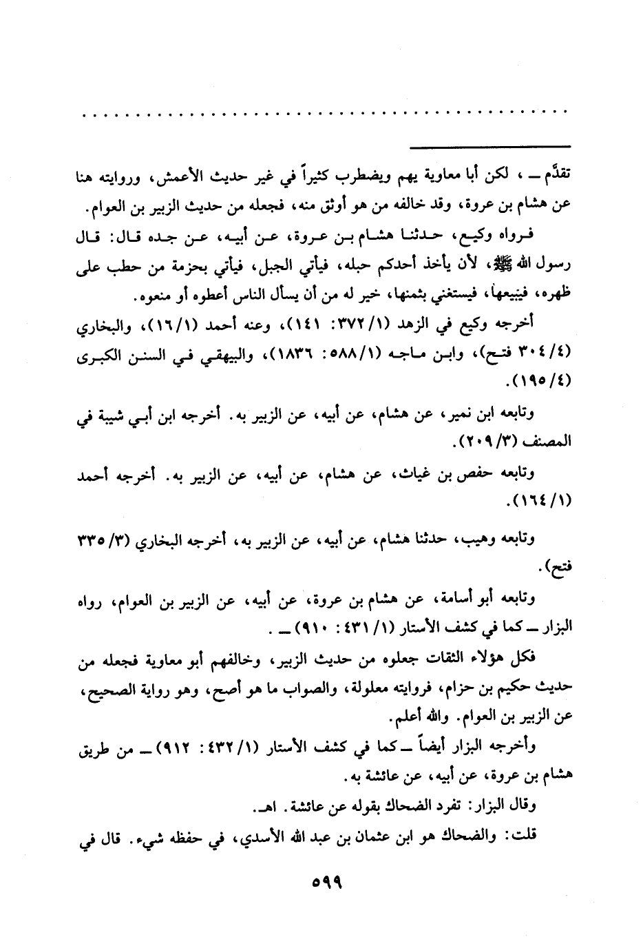 = تقدَّم-، لكن أبا معاوية يهم ويضطرب كثيرًا في غير حديث الأعمش، وروايته هنا عن هشام بن عروة، وقد خالفه من هو أوثق منه، فجعله من حديث الزبير بن العوام.