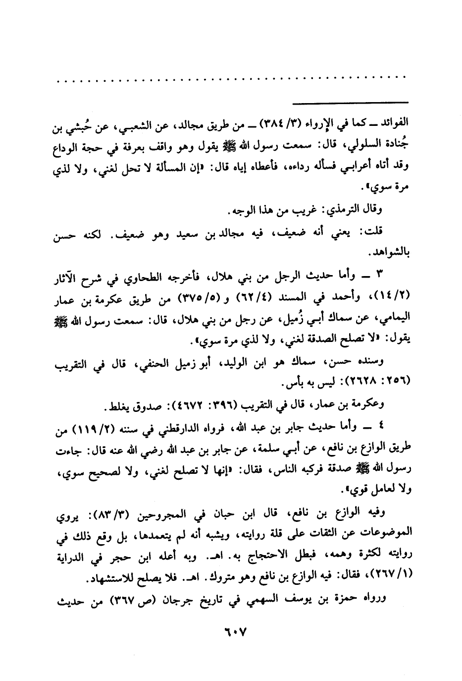 = الفوائد -كما في الإرواء (3/ 384) - من طريق مجالد، عن الشعبي، عن حُبشي بن جُنادة السلولي، قال: سمعت رسول الله -صلى الله عليه وسلم- يقول وهو واقف بعرفة في حجة الوداع وقد أتاه أعرابي فسأله رداءه، فأعطاه إياه قال: "إن المسألة لا تحل لغني، ولا لذي مرة سوي".