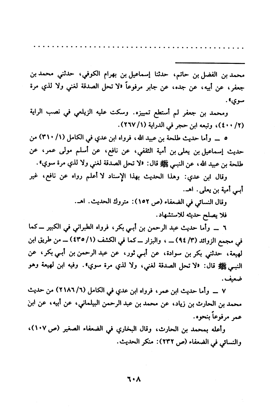 5 - وأما حديث طلحة بن عبيد الله، فرواه ابن عدي في الكامل (1/ 310) من حديث إسماعيل بن يعلي بن أمية الثقفي، عن نافع، عن أسلم مولى عمر، عن طلحة بن عبيد اللَّهِ، عَنِ النَّبِيِّ -صَلَّى اللَّهُ عَلَيْهِ وَسَلَّمَ- قال: "لَا تَحِلُّ الصَّدَقَةُ لِغَنِيٍّ وَلَا لِذِي مِرَّةٍ سوي".