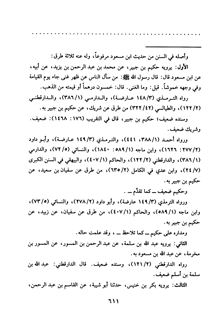 = وأصله في السنن من حديث ابن مسعود مرفوعًا، وله عنه ثلاثة طرق: الأول: يرويه حكيم بن جبير، عَنْ مُحَمَّدِ بْنِ عَبْدِ الرَّحْمَنِ بْنِ يَزِيدَ، عن أبيه، عَنِ ابْنِ مَسْعُودٍ قَالَ: قَالَ رَسُولُ اللَّهِ -صَلَّى اللَّهُ عليه وسلم-: من سأل الناس عن ظهر غنى جاء يوم القيامة وفي وجهه خموشًا. قيل: وما الغنى. قال: خمسون درهمًا أو قيمته من الذهب.