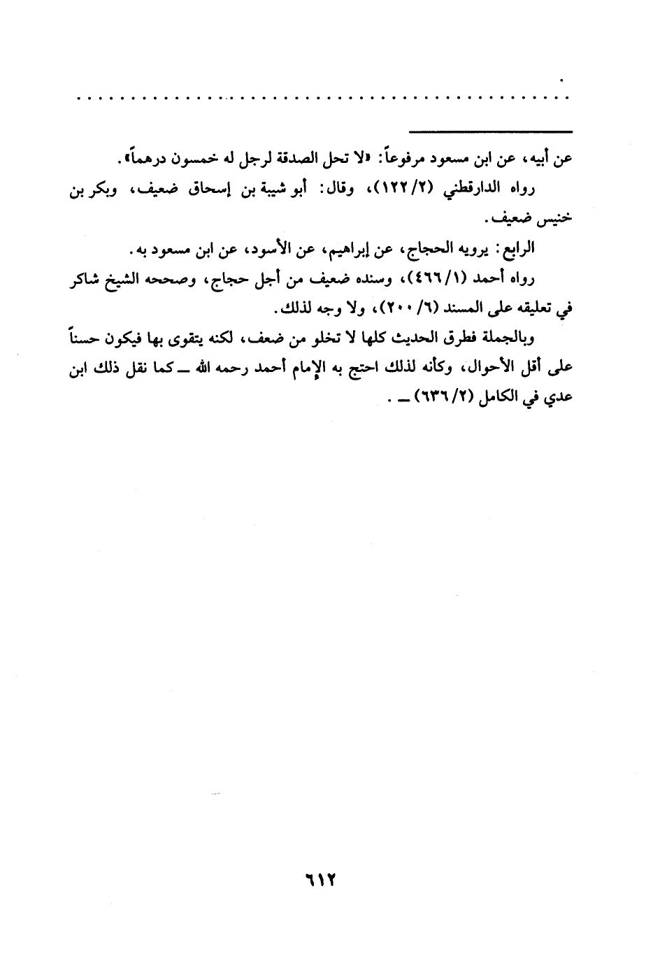 = عن أبيه، عن ابن مسعود مرفوعًا: "لا تحل الصدقة لرجل له خمسون درهمًا".