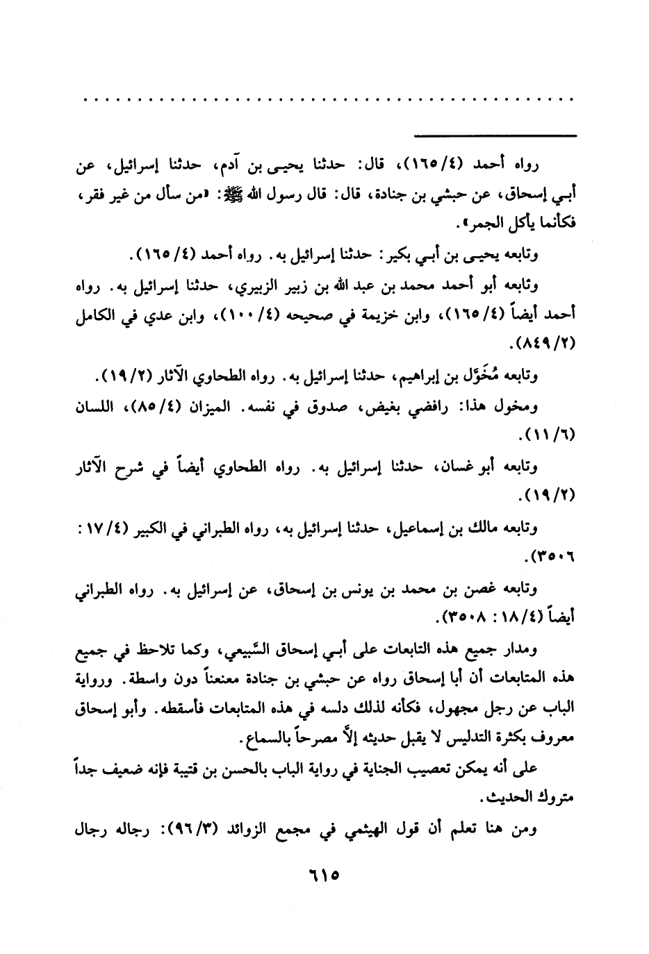 ومدار جميع هذه التابعات على أبي إسحاق السبيعي، وكما تلاحظ في جميع هذه المتابعات أن أبا إسحاق رواه عن حبشي بن جنادة معنعنًا دون واسطة. ورواية الباب عن رجل مجهول، فكأنه لذلك دلسه في هذه المتابعات فأسقطه. وأبو إسحاق معروف بكثرة التدليس لا يقبل حديثه إلَّا مصرحًا بالسماع.