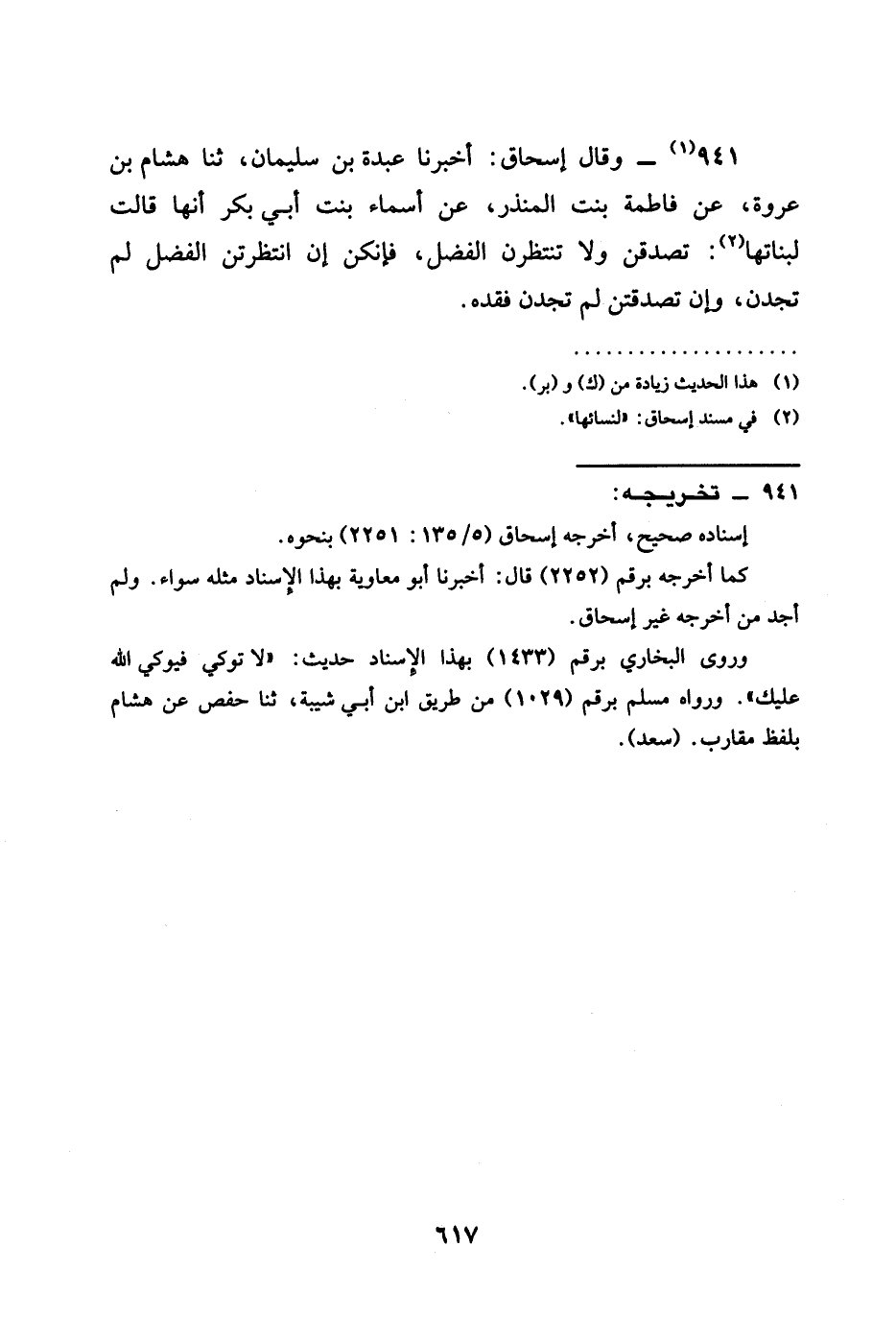 أَخْبَرَنَا عَبَدَةُ بَنُ سُلَيْمَانَ ثَنَا هِشَامُ بْنُ عُرْوَةَ عن فاطمة بن الْمُنْذِرِ عَنْ أَسْمَاءَ بِنْتِ أَبِي بَكْرٍ أَنَّهَا قَالَتْ لِبَنَاتِهَا §تَصَدَّقْنَ وَلَا تنظرن الفضل فإنكن إِنِ انْتَظَرْتُنَّ الْفَضْلَ لم تجدن وإن تصدقتن لَمْ تَجِدْنَ فَقْدَهُ