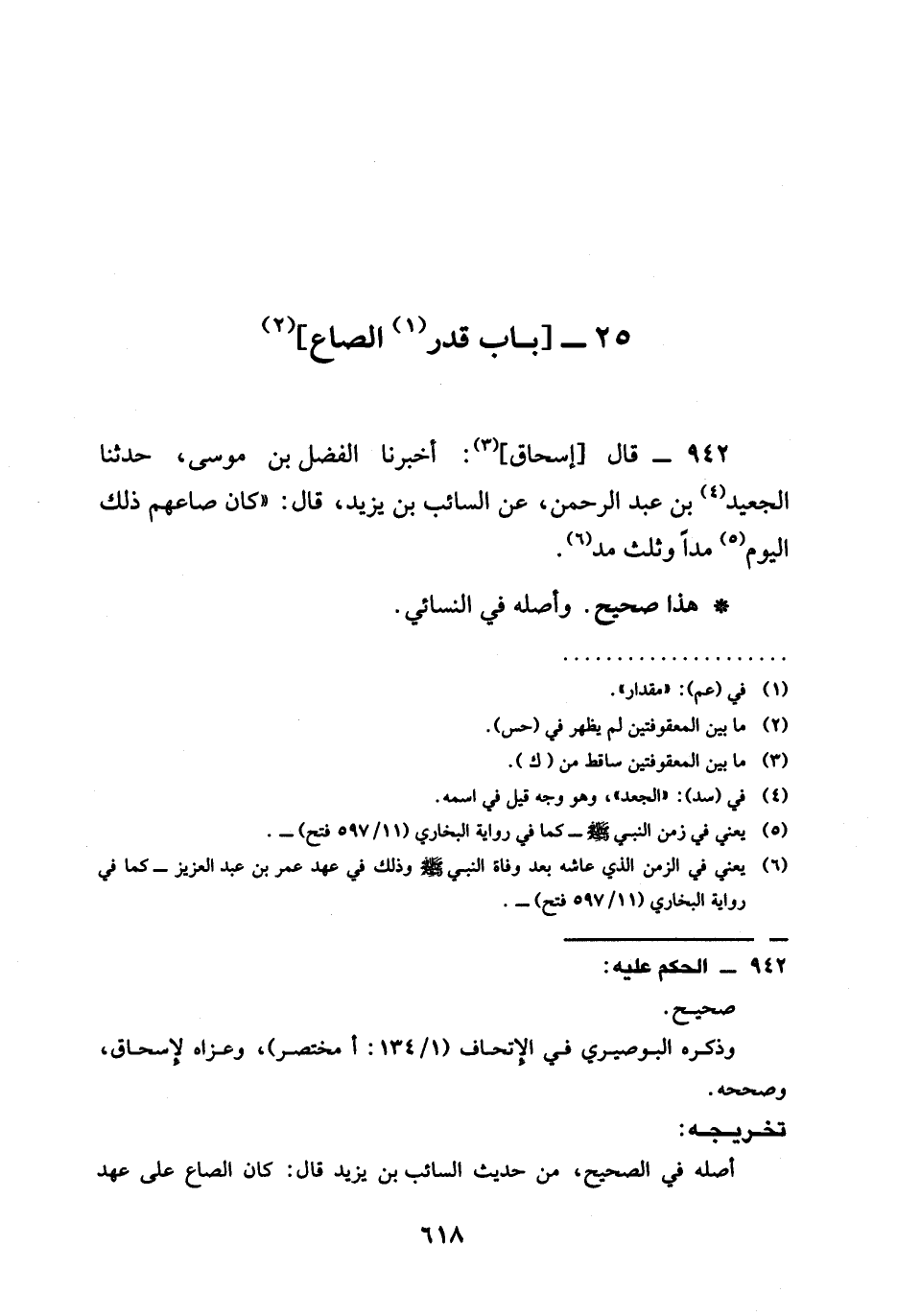 أَخْبَرَنَا الْفَضْلُ بْنُ مُوسَى حَدَّثَنَا الْجُعَيْدُ بْنُ عَبْدُ الرَّحْمَنِ عَنِ السَّائِبِ بْنِ يَزِيدَ قَالَ §كَانَ صَاعُهُمْ ذَلِكَ الْيَومَ مُدًّا وَثُلُثَ مُدٍّ