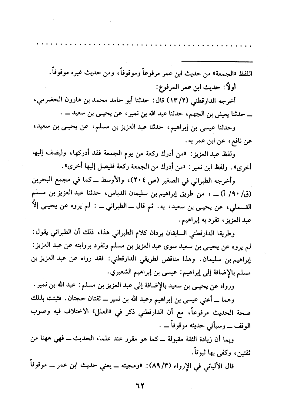 ولفظ عبد العزيز: "من أدرك ركعة من يوم الجمعة فقد أدركها، وليضف إليها أخرى". ولفظ ابن نمير: "مَنْ أَدْرَكَ مِنَ الْجُمُعَةِ رَكْعَةً فَلْيُصَلِّ إِلَيْهَا أخرى". وأخرجه الطبراني في الصغير (ص204)، والأوسط -كما في مجمع البحرين (ق/ 90/ أ) -، من طريق إبراهيم بن سليمان الدباس، حدثنا عبد العزيز بن مسلم القسملي، عن يحيى بن سعيد، به. ثم قال -الطبراني-: لم يروه عن يحيى إلَّا عبد العزيز، تفرد به إبراهيم.