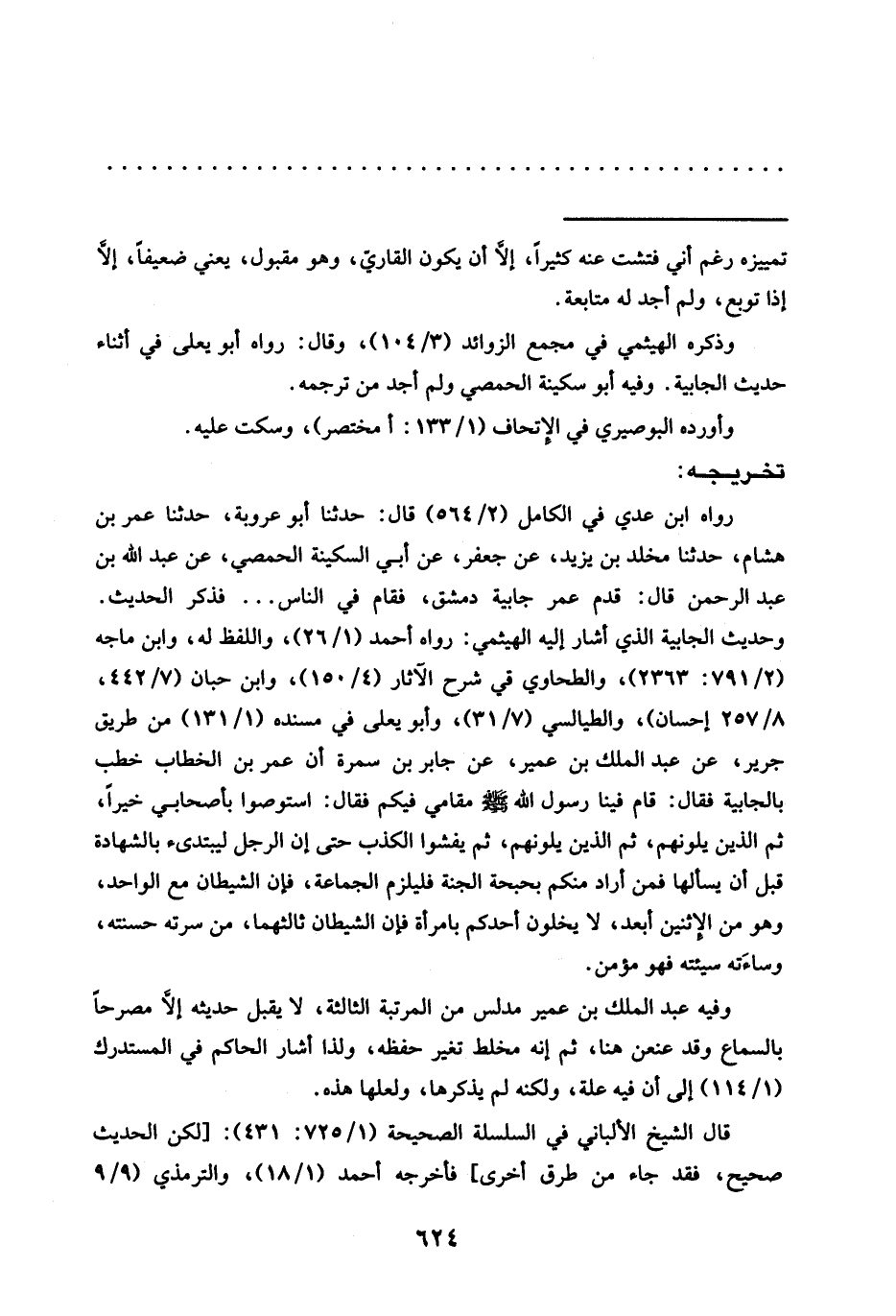 وحديث الجابية الذي أشار إليه الهيثمي: رواه أحمد (1/ 26)، واللفظ له، وابن ماجه (2/ 791: 2363)، والطحاوي في شرح الآثار (4/ 150)، وابن حبان (7/ 442، 8/ 257 إحسان)، والطيالسي (7/ 31)، وأبو يعلى في مسنده (1/ 131) من طريق جَرِيرٌ، عَنْ عَبْدِ الْمَلِكِ بْنِ عُمَيْرٍ، عَنْ جابر بن سمرة أن عمر بن الخطاب خطب بالجابية فقال: قام فينا رسول الله -صلى الله عليه وسلم- مقامي فيكم فقال: استوصوا بأصحابي خيرًا، ثُمَّ الَّذِينَ يَلُونَهُمْ، ثُمَّ الَّذِينَ يَلُونَهُمْ، ثُمَّ يفشوا الكذب حتى إن الرجل ليبتدىء بالشهادة قبل أن يسألها فمن أراد منكم بحبحة الجنة فليلزم الجماعة، فإِن الشيطان مع الواحد، وهو من الإثنين أبعد، لا يخلون أحدكم بامرأة فإِن الشيطان ثالثهما، من سرته حسنته، وساءَته سيئته فهو مؤمن.