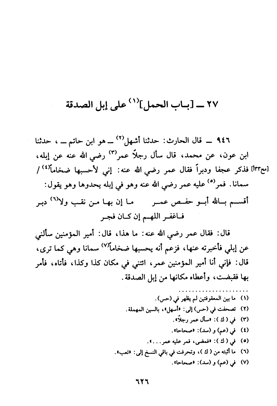 حَدَّثَنَا أَشْهَلُ - هُوَ ابْنُ حَاتِمٍ حدثنا ابْنُ عَوْنٍ عن محمد قال سَأَلَ رجلا عمر رَضِيَ الله عَنْه عن إبله فَذَكَرَ عَجَفًا وَدَبَرًا فقال عمر رَضِيَ الله عَنْه §إِنِّي لَأَحْسِبُهَا ضِخَامًا سِمَانًا فَمَرَّ عليه عمر رَضِيَ الله عَنْه وَهُوَ فِي إِبِلِهِ يَحْدُوهَا وَهُوَ يَقُولُ