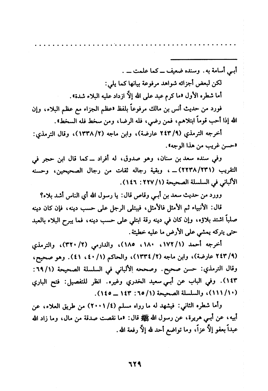 وورد من حديث سعد بن أبي وقاص قال: يا رسول الله أي الناس أشد بلاءً؟ قال: الأنبياء ثم الأمثل فالأمثل، فيبتلى الرجل على حسب دينه، فإِن كان دينه صلبًا اشتد بلاؤه، وإن كان في دينه رقة ابتلي على حسب دينه، فما يبرح النبلاء بالعبد حتى يتركه يمشي على الأرض ما عليه خطيئة.