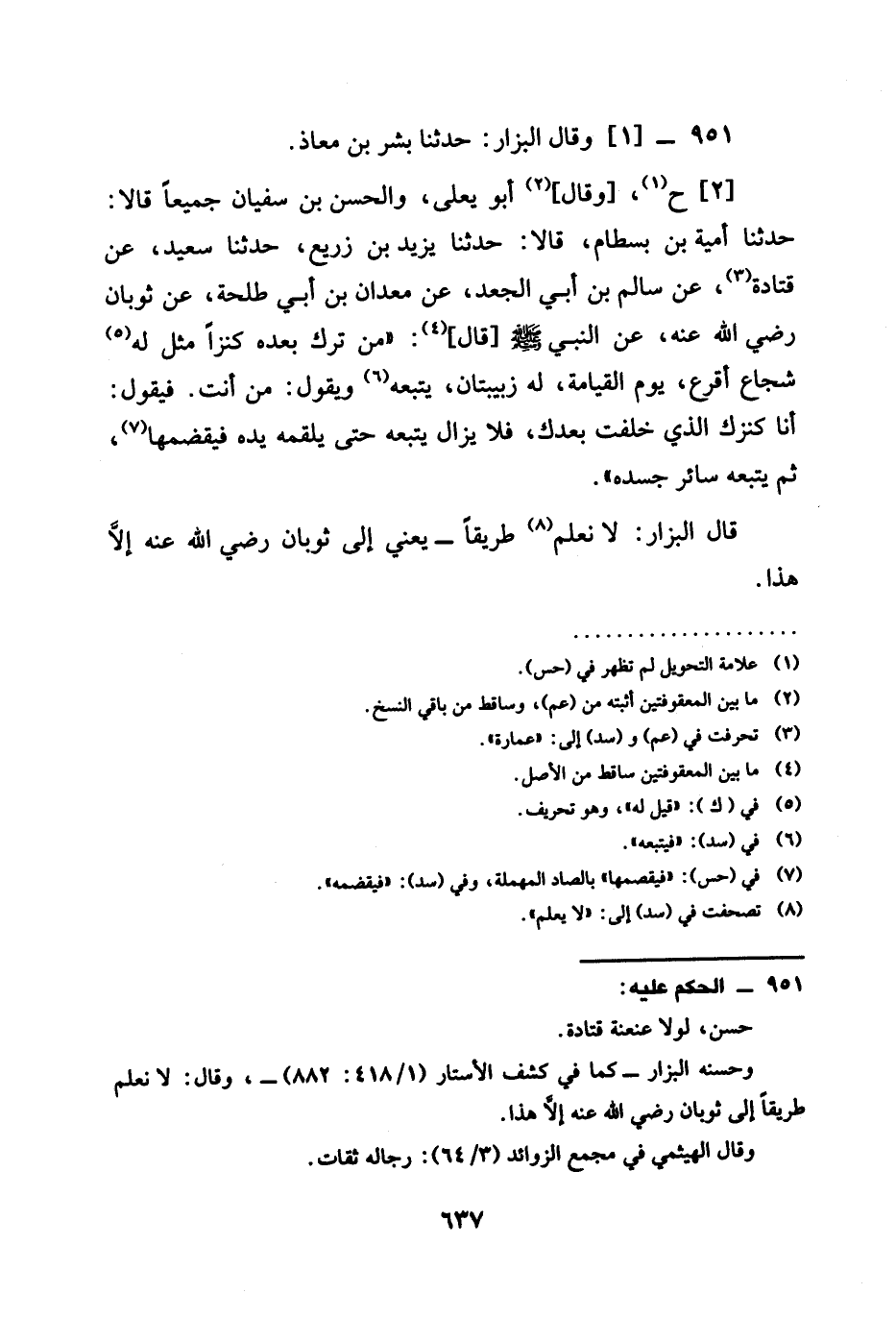 أبو يَعْلَى وَالْحَسَنُ بْنُ سُفْيَانَ جَمِيعًا قالا حَدَّثَنَا أُمَيَّةُ بن بسطام قالا حدثنا يَزِيدُ بْنُ زُرَيْعٍ حدثنا سَعِيدٌ عَنْ قَتَادَةَ عَنْ سَالِمِ بْنِ أَبِي الْجَعْدِ عَنْ مَعْدَانَ بْنِ أَبِي طَلْحَةَ عن ثوبان رَضِيَ الله عَنْه عَنْ النَّبِيِّ صَلَّى اللَّهُ عَلَيْهِ وَسَلَّمَ قَالَ §مَنْ تَرَكَ بَعْدَهُ كَنْزًا مُثِّلَ لَهُ شُجَاعٌ أَقْرَعُ يَوْمَ الْقِيَامَةِ لَهُ ربيبتان يَتْبَعُهُ وَيَقُولُ مَنْ أَنْتَ فَيَقُولُ أَنَا كَنْزُكَ الَّذِي خَلَّفْتَ بَعْدَكَ فَلَا يَزَالُ يَتْبَعُهُ حَتَّى يُلْقِمَهُ يَدَهُ فَيْقَضِمُهَا ثُمَّ يُتْبِعَهُ سَائِرَ جَسَدِهِ قَالَ الْبَزَّارُ لَا نَعْلَمُ طرقا يَعْنِي إلى ثوبان رَضِيَ الله عَنْه إِلَّا هَذَا
