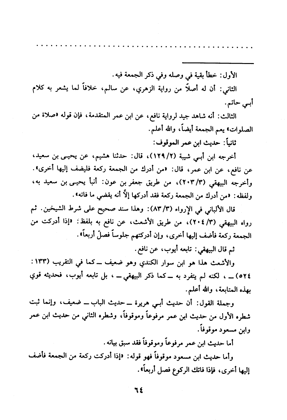 قال الألباني في الإرواء (3/ 83): وهذا سند صحيح على شرط الشيخين. ثم رواه البيهقي (3/ 204)، من طريق الأشعث، عن نافع به بلفظ "إذا أدركت من الجمعة ركعة فأضف إليها أخرى، وإن أدركتهم جلوسًا فصل أربعًا".