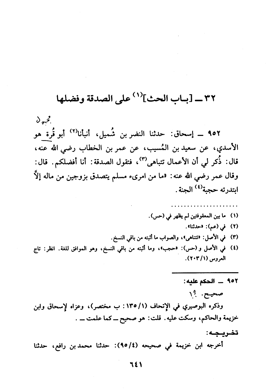 حدثنا النَّضْرُ بن شميل أنبأنا أَبُو قُرَّةَ هُوَ الْأَسَدِيُّ عَنْ سَعِيدِ بْنِ الْمُسَيِّبِ عَنْ عُمَرَ بن الخطاب رَضِيَ الله عَنْه قَالَ ذُكِرَ لِي أَنَّ §الْأَعْمَالَ تتباهى فَتَقُولُ الصَّدَقَةُ أَنَا أَفْضَلُكُمُ