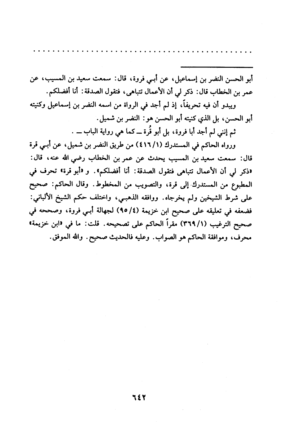 ورواه الحاكم في المستدرك (1/ 416) من طريق النضر بن شميل، عن أبي قرة قَالَ: سَمِعْتُ سَعِيدَ بْنَ الْمُسَيِّبِ يُحَدِّثُ عَنْ عُمَرَ بْنِ الْخَطَّابِ رَضِيَ اللَّهُ عَنْهُ، قَالَ: "ذكر لي أن الأعمال تتباهى فتقول الصدقة: أنا أفضلكم". و"أبو قرة" تحرف في المطبوع من المستدرك. إلى قرة، والتصويب من المخطوط. وقال الحاكم: صحيح على شرط الشيخين ولم يخرجاه. ووافقه الذهبي، واختلف حكم الشيخ الألباني: